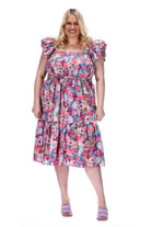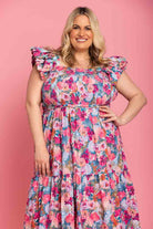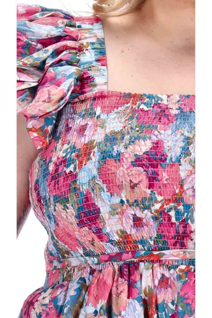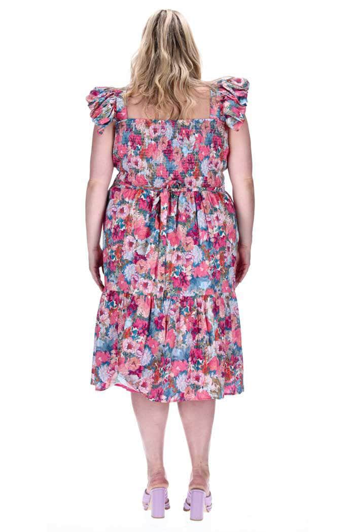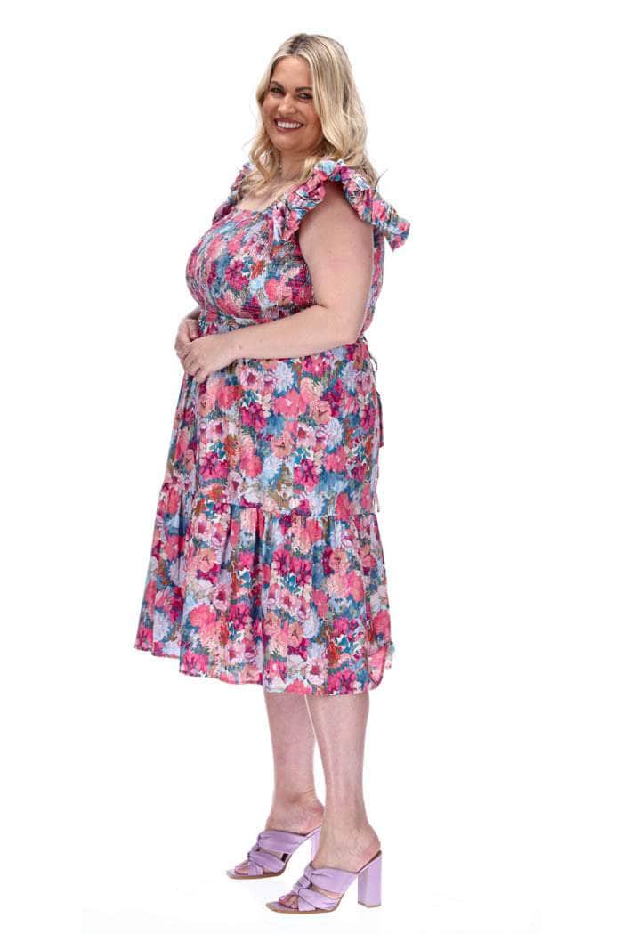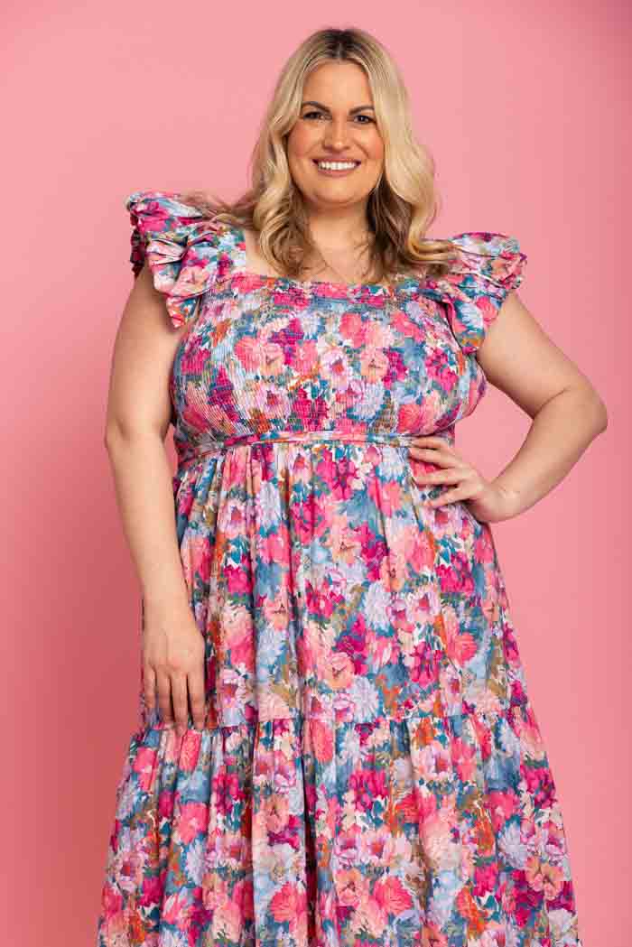 A pink floral print midi dress with frilly shoulder straps.