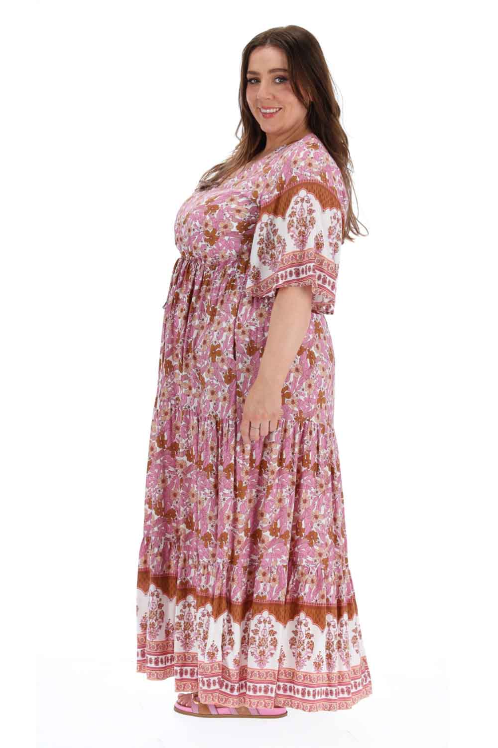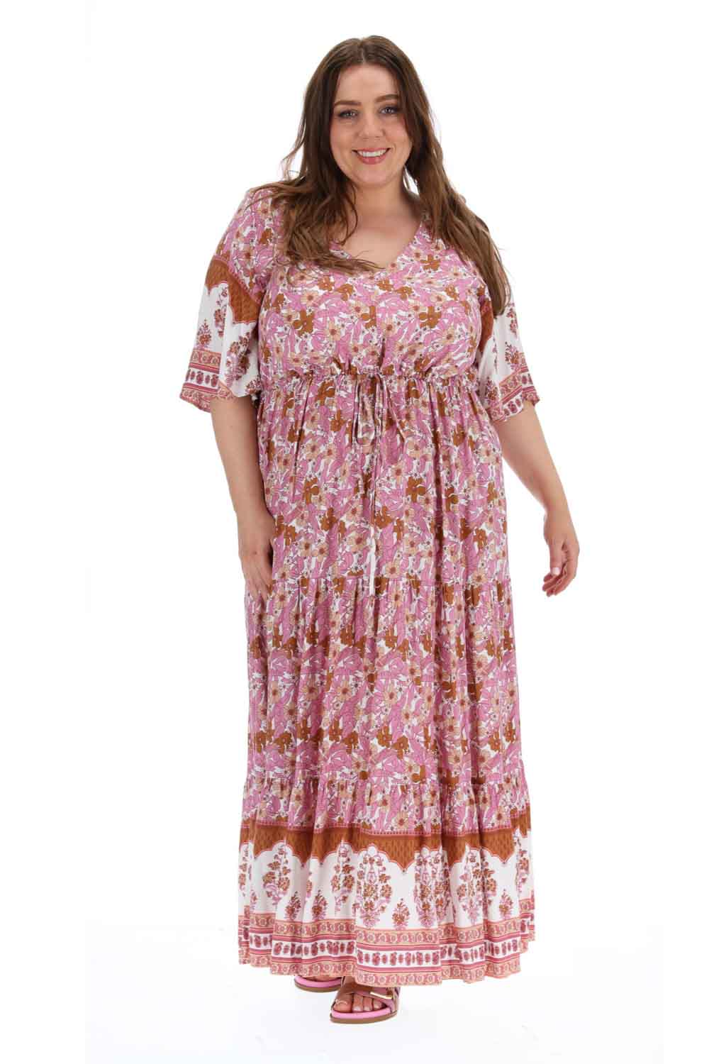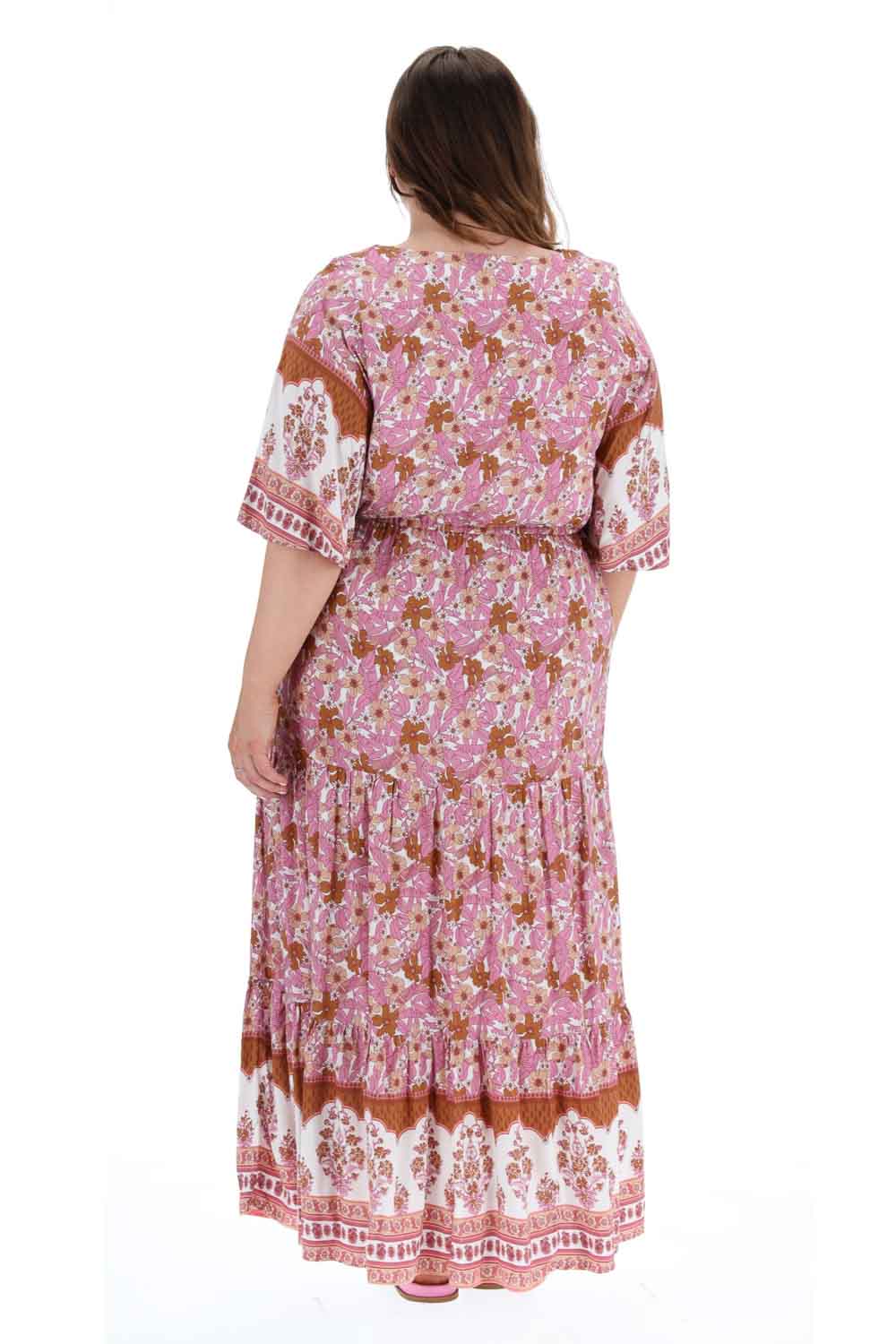 A plus size pink floral boho style maxi dress.