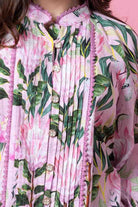 A pink & green floral print pintucked blouse.