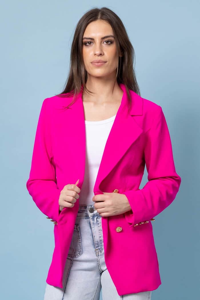 A tan double-breasted linen blazer.