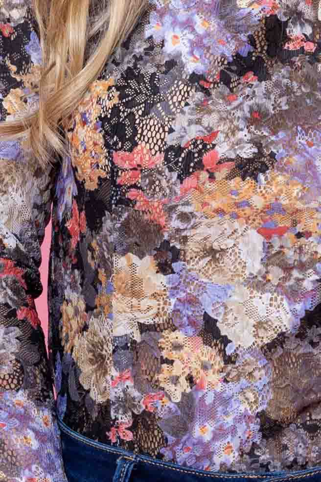 A black lace floral print long-sleeve top.