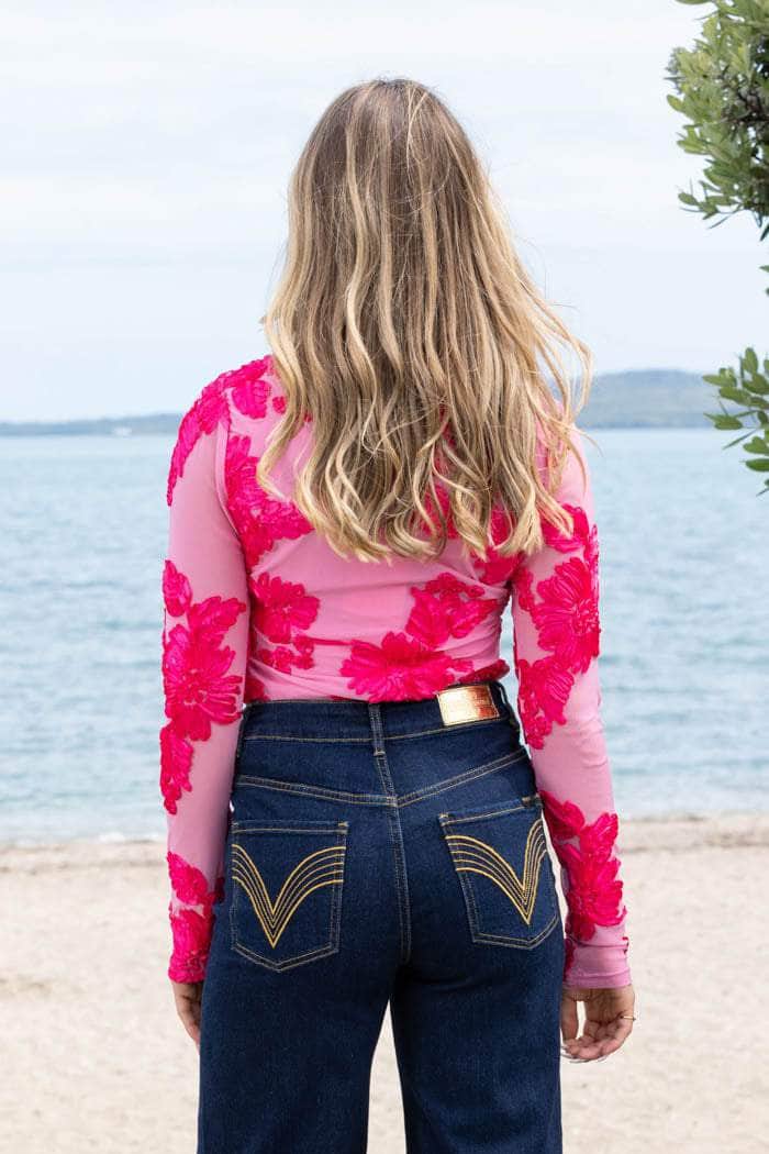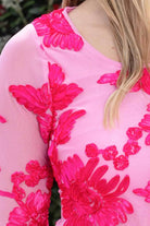 A hot pink mesh top with embroidered floral print.
