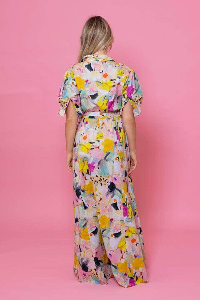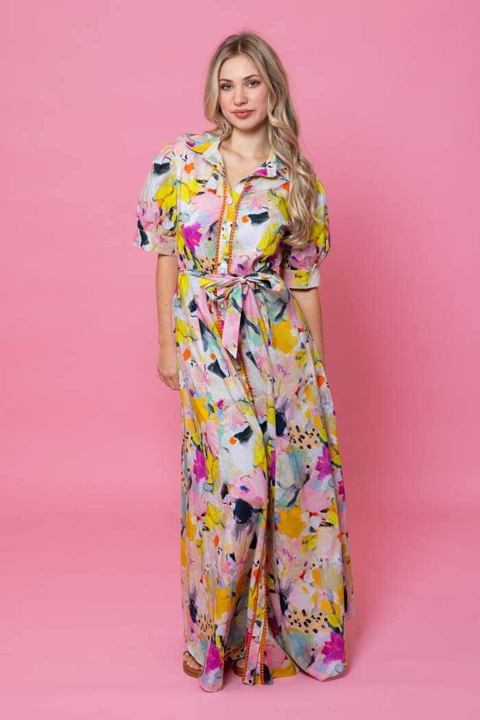 A yellow abstract print maxi shirt dress.