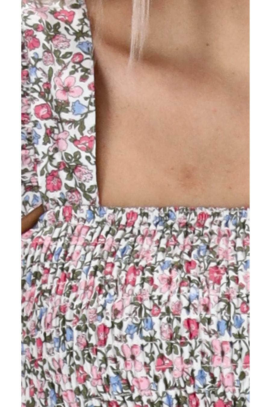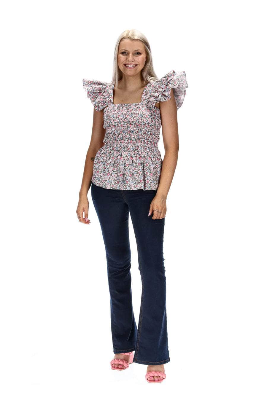 A micro floral print shirred top with frilly shoulder straps.