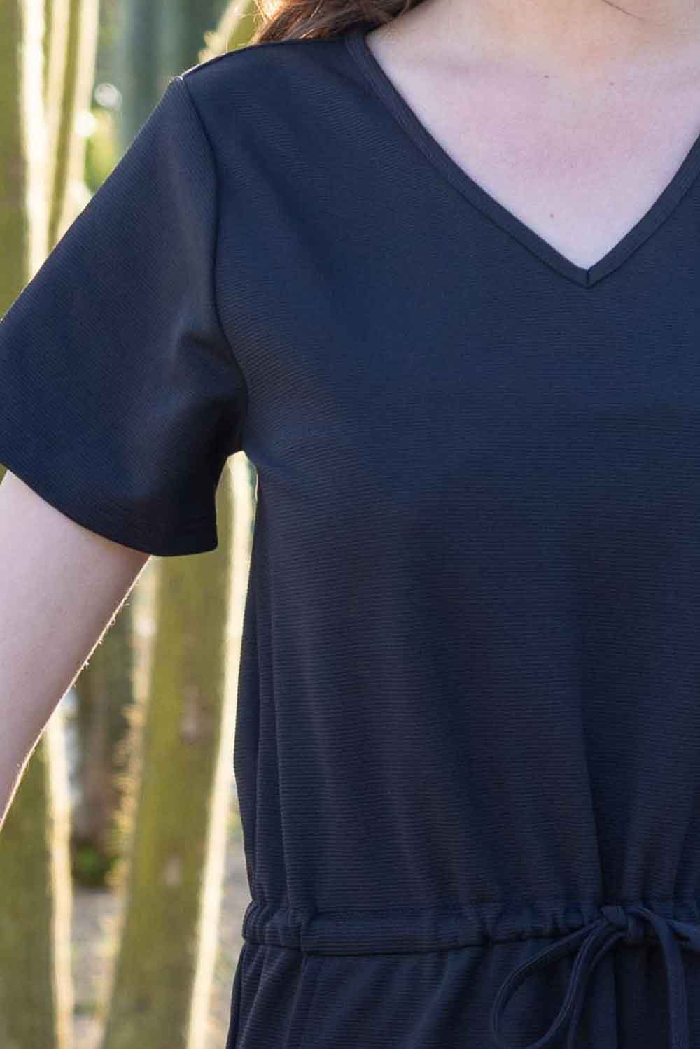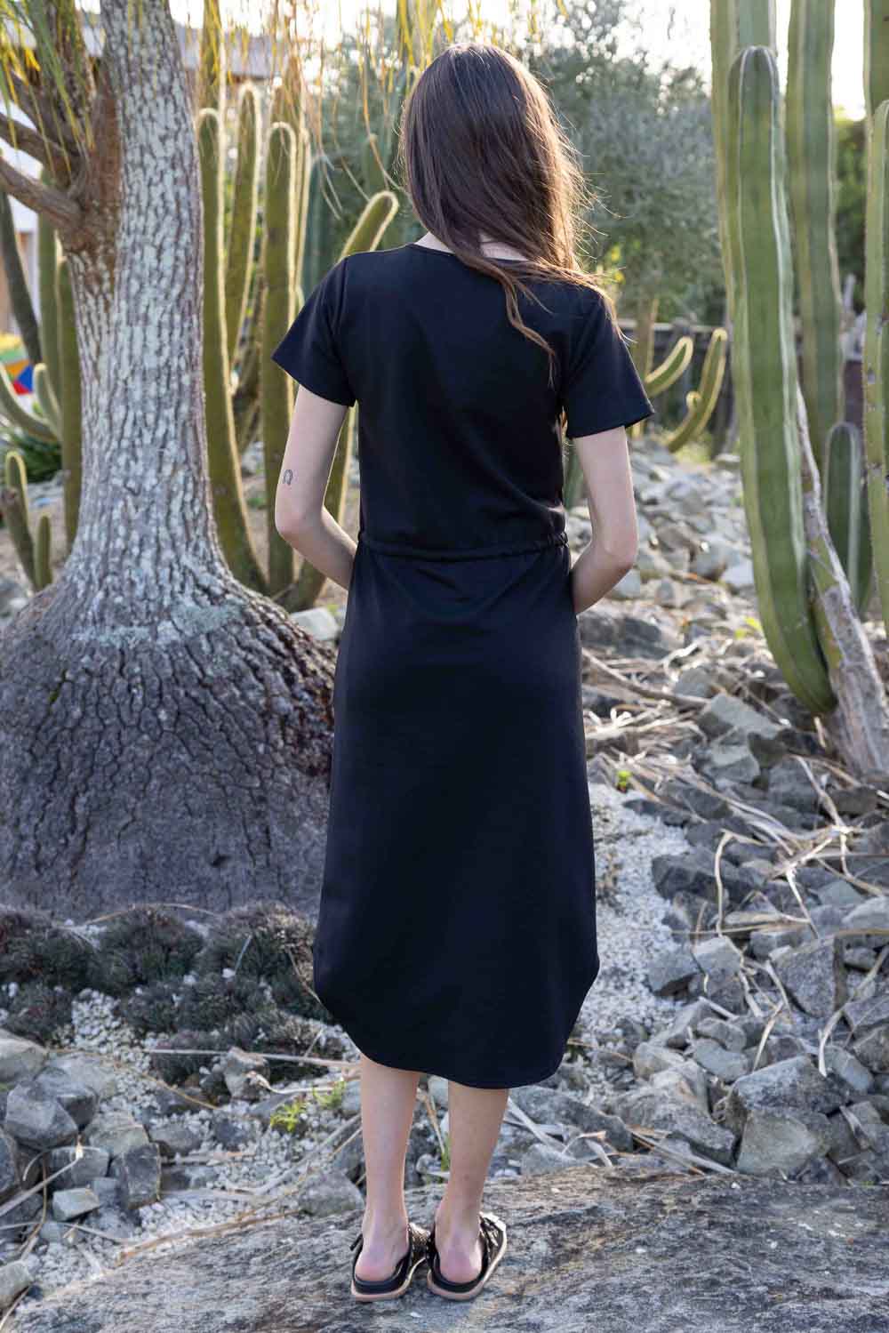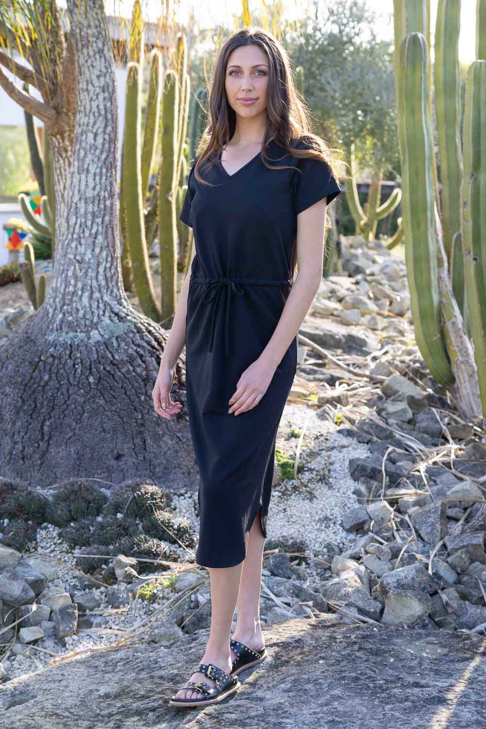 A stretchy black marle jersey midi dress with drawstring waistline.