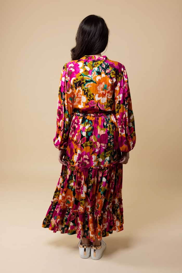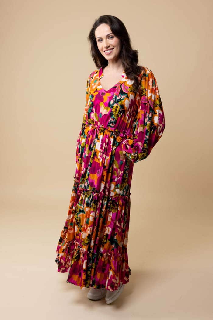 A pink & orange floral V-neck tiered maxi dress.