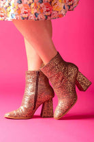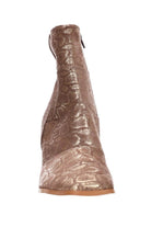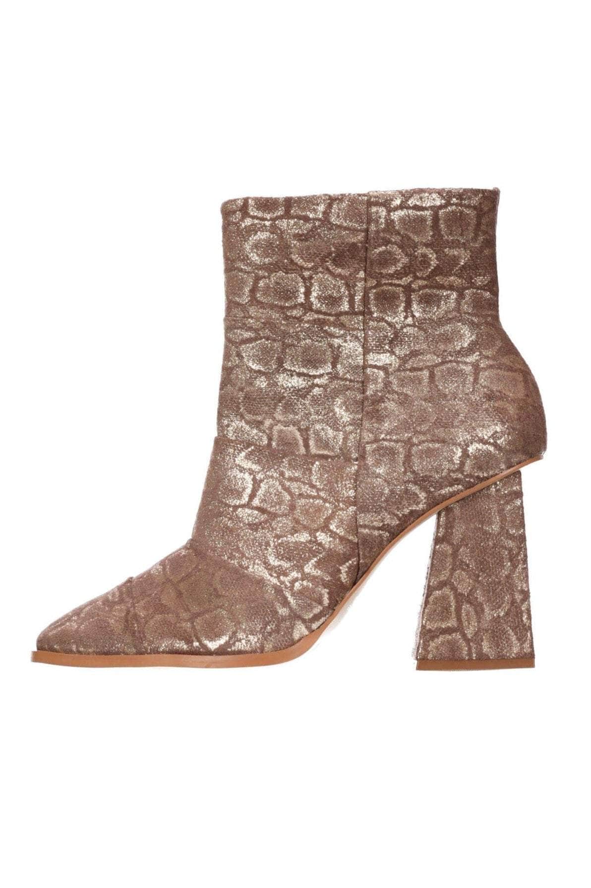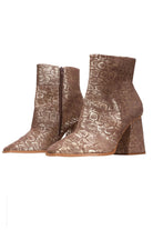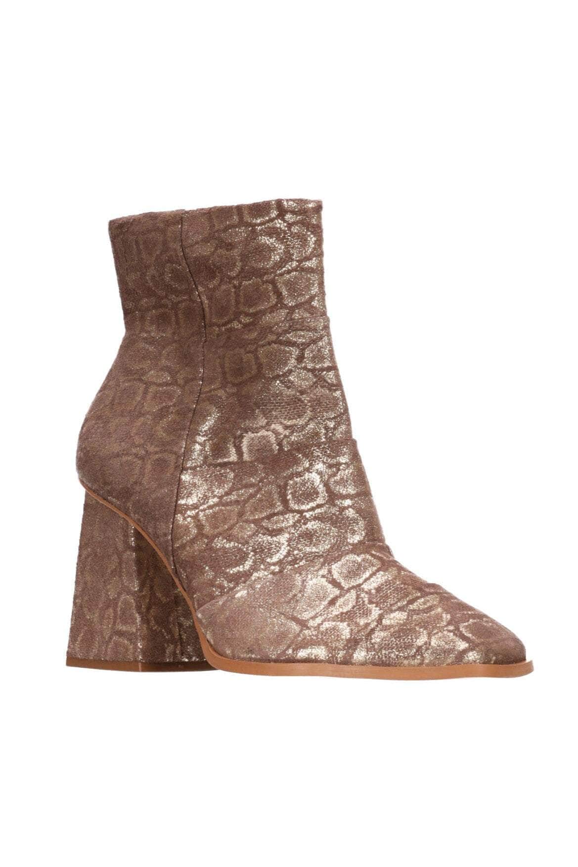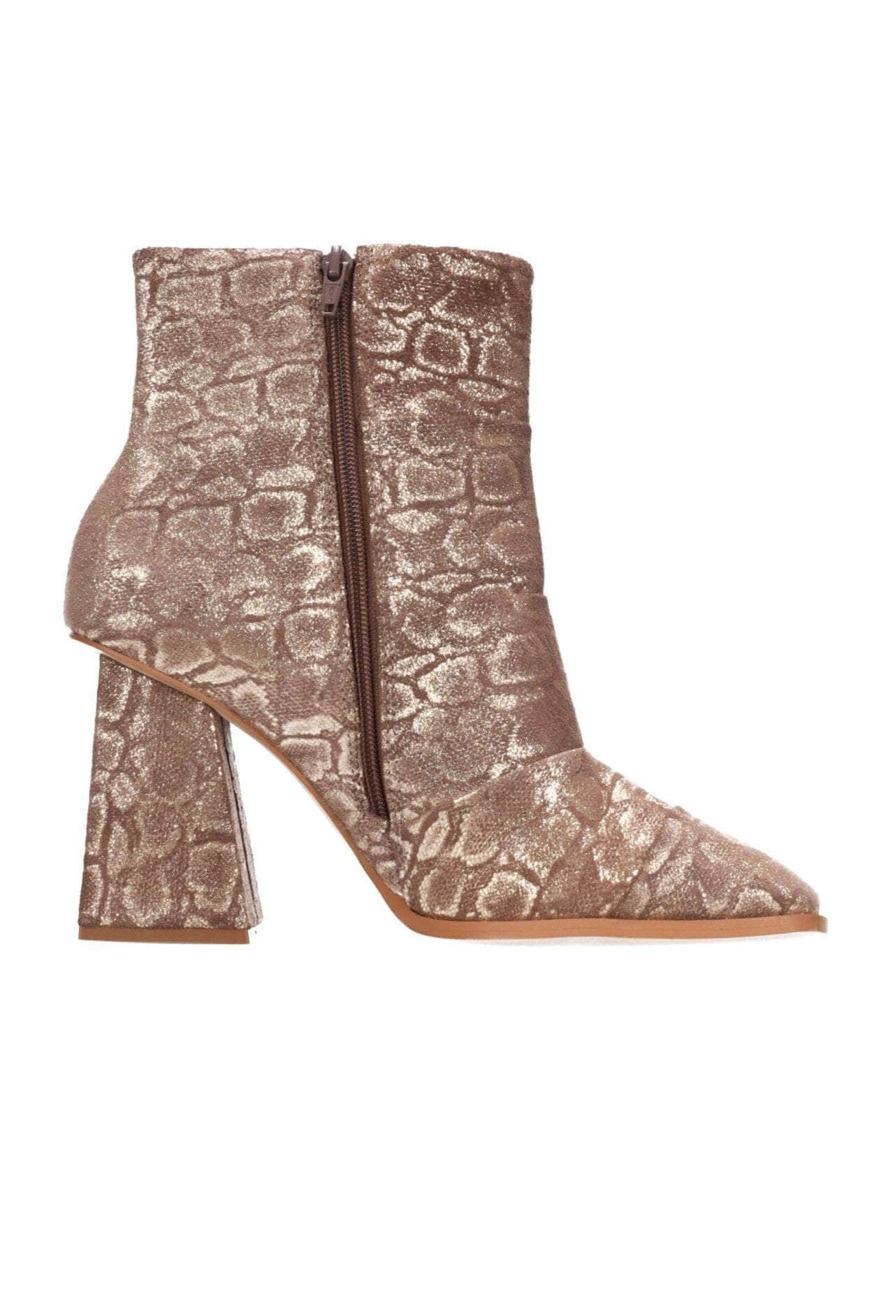 A bronze snakeskin print boot with block heel.