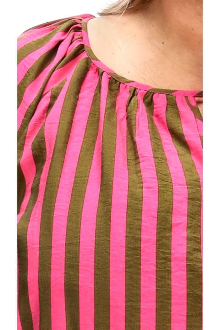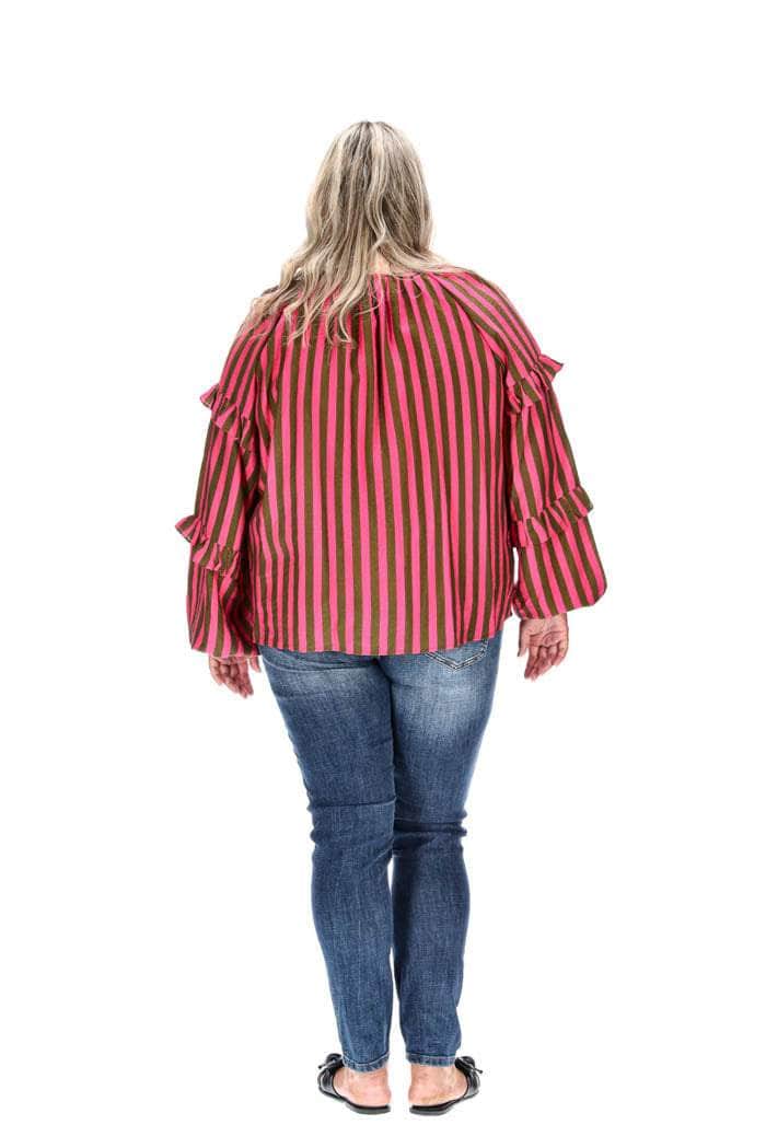 A pink & khaki stripe print frilly blouse.