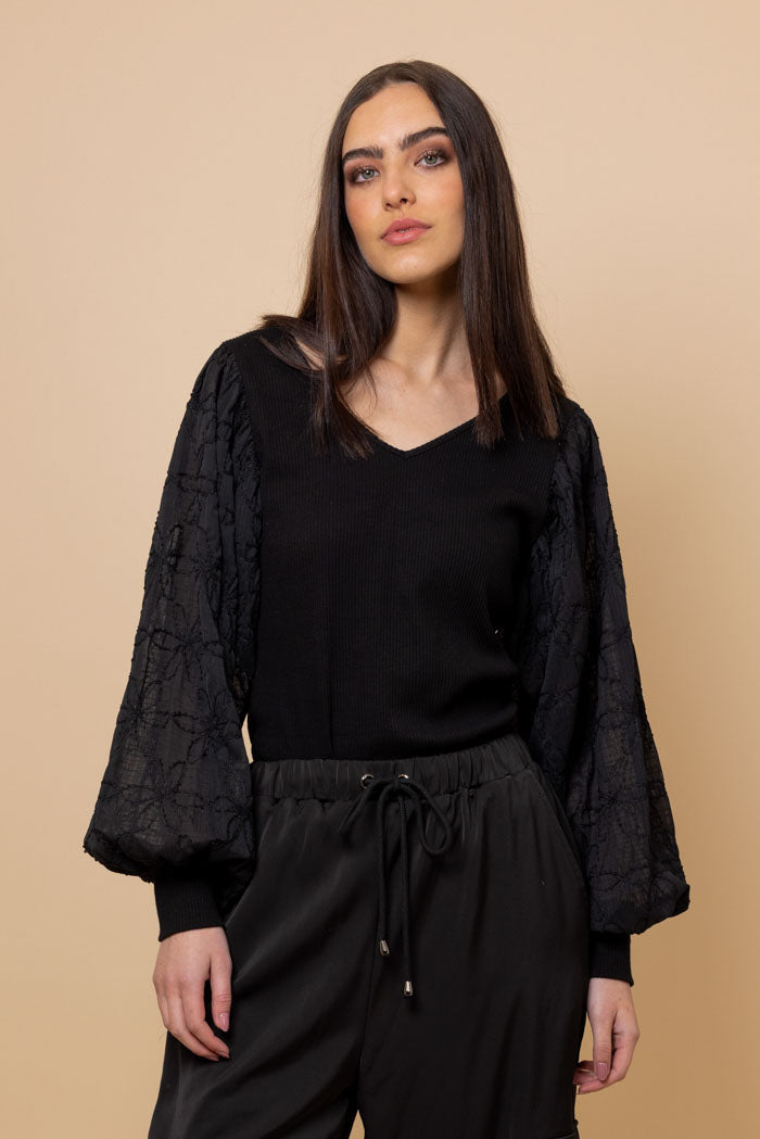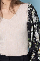 A beige ribbed top with black floral print sleeves.