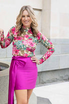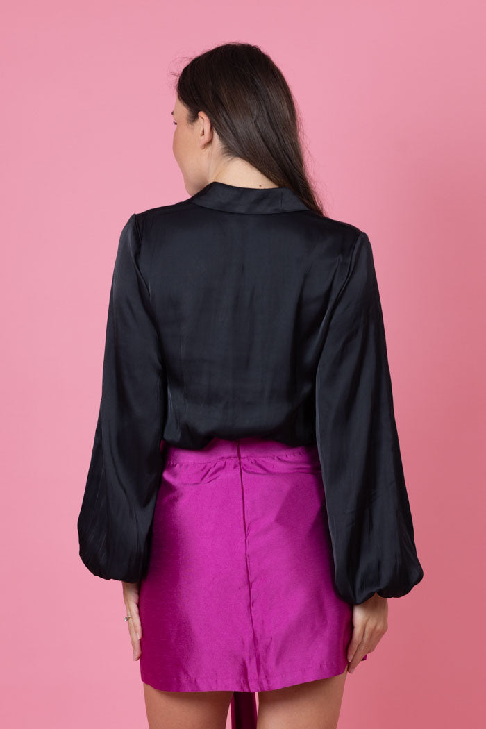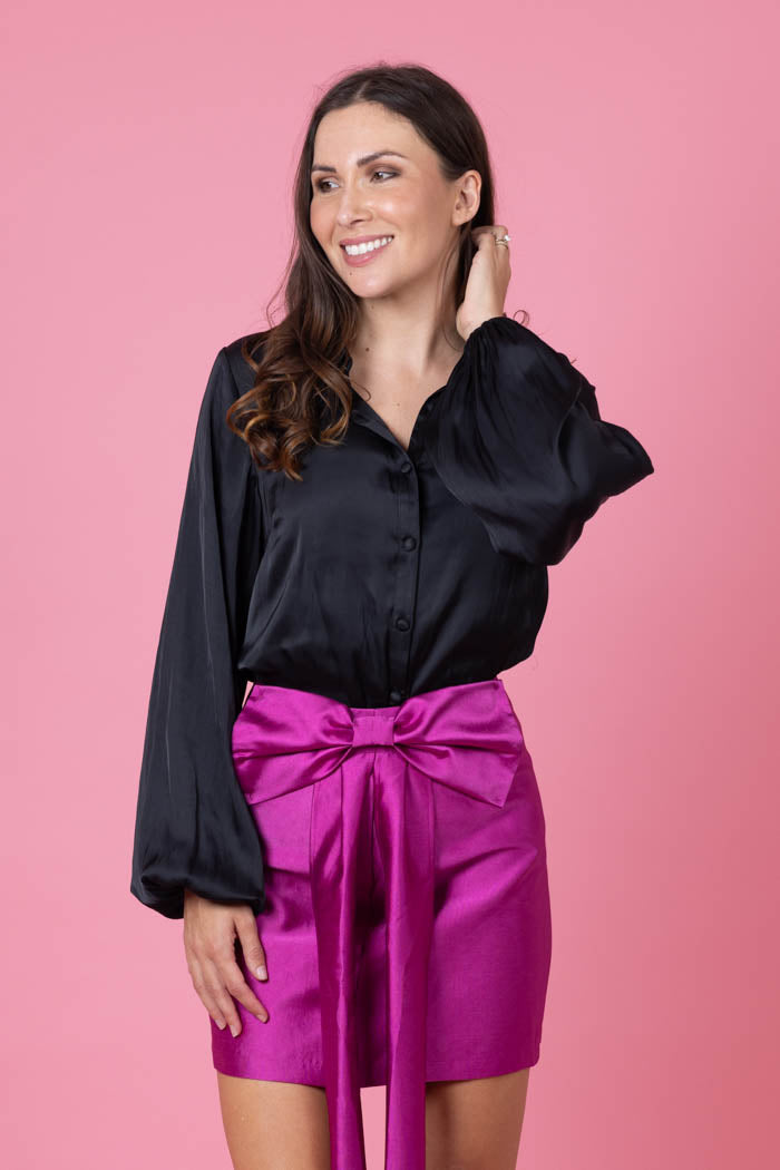A shiny purple mini skirt with bow. Wear the bow at the front or to the side!