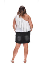 A pretty black distressed denim mini skirt with an elasticated waist, side & back pockets, faux fly zip stitching, and a soft curved hem