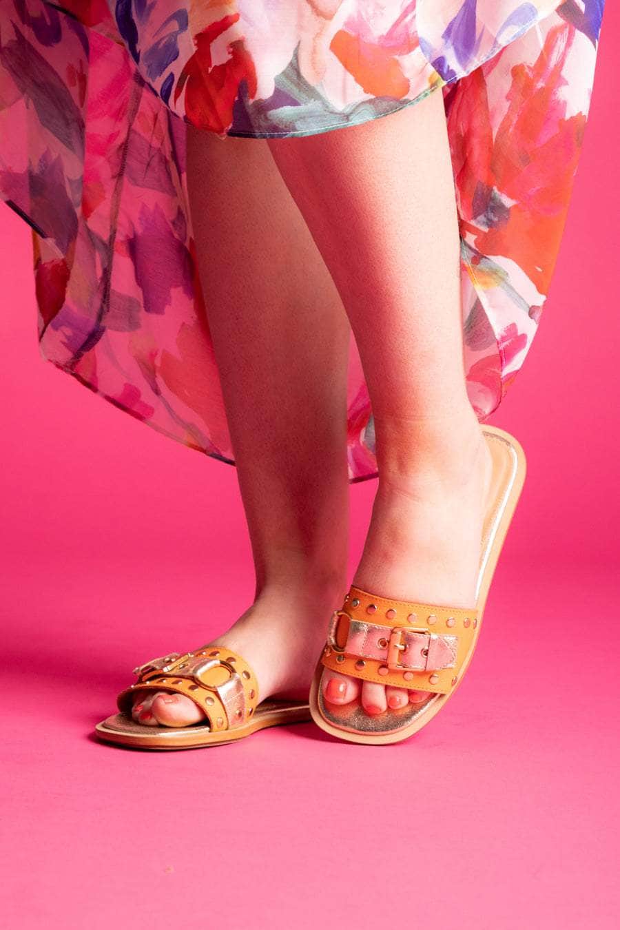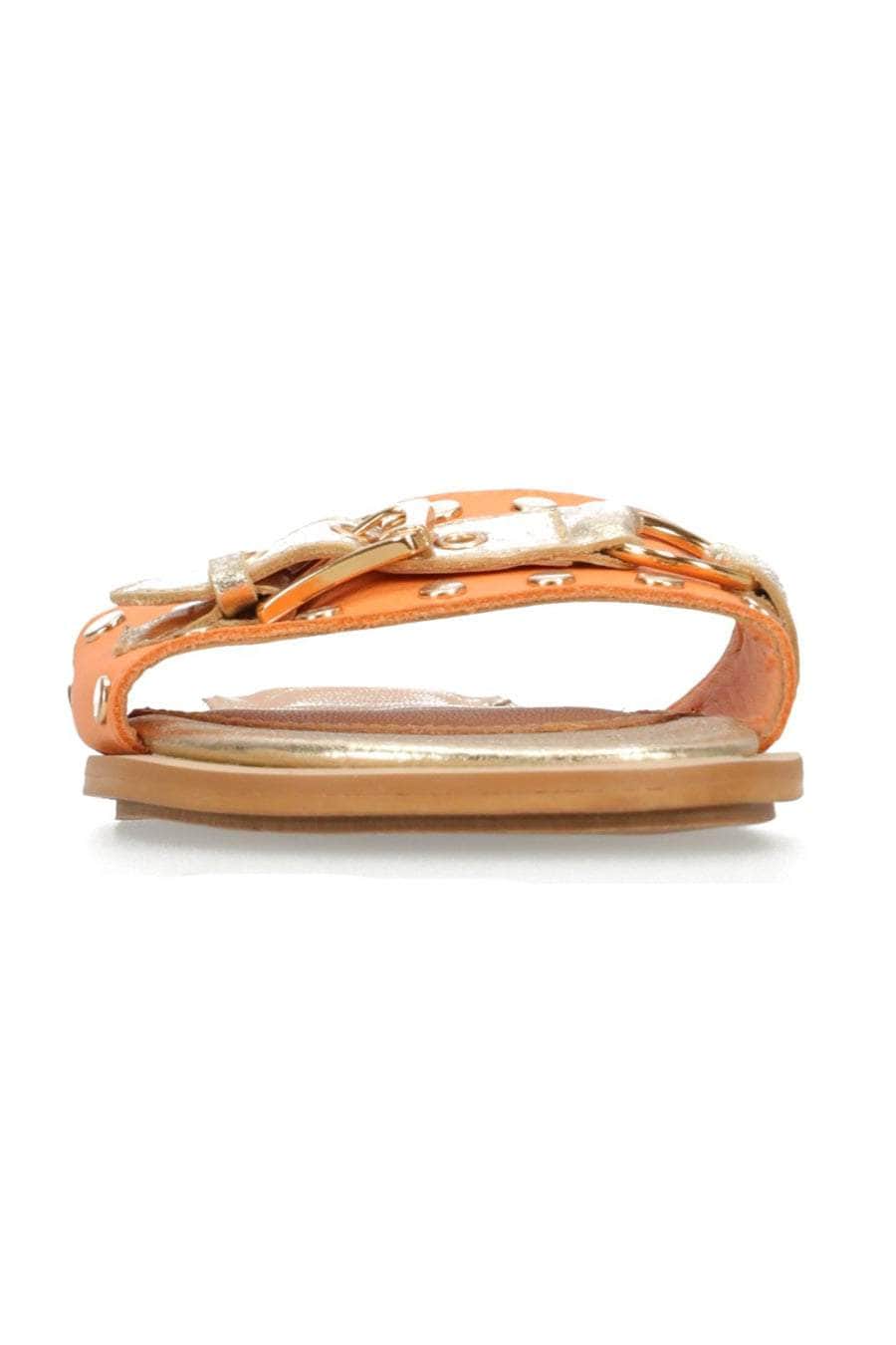 An orange & gold sandal with a buckle strap, adorned with gold circle studs.