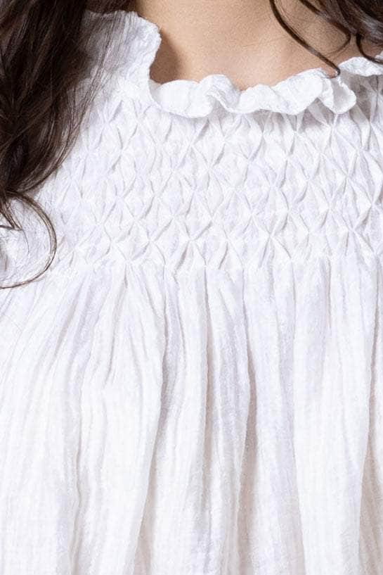 A white crinkle blouse with smocked neckline.