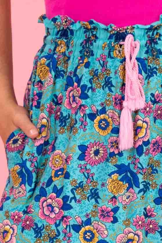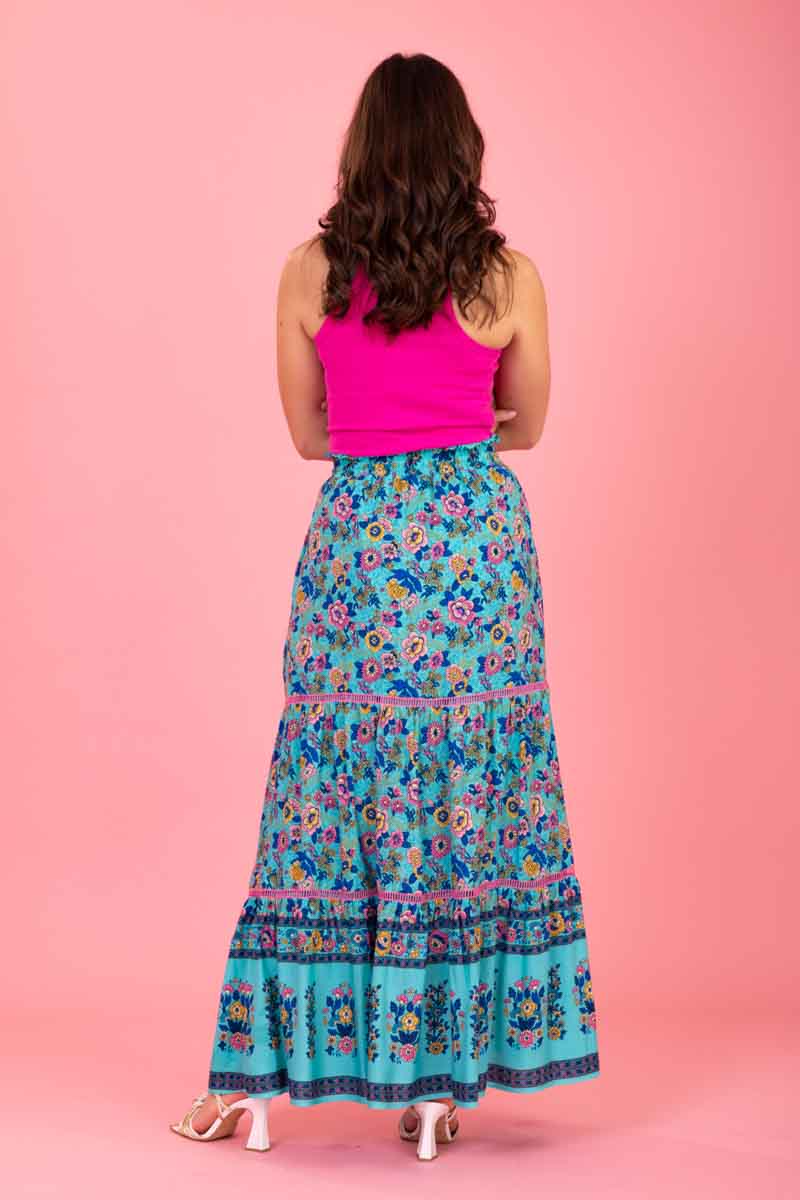 A teal blue floral print tiered maxi skirt.