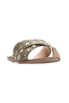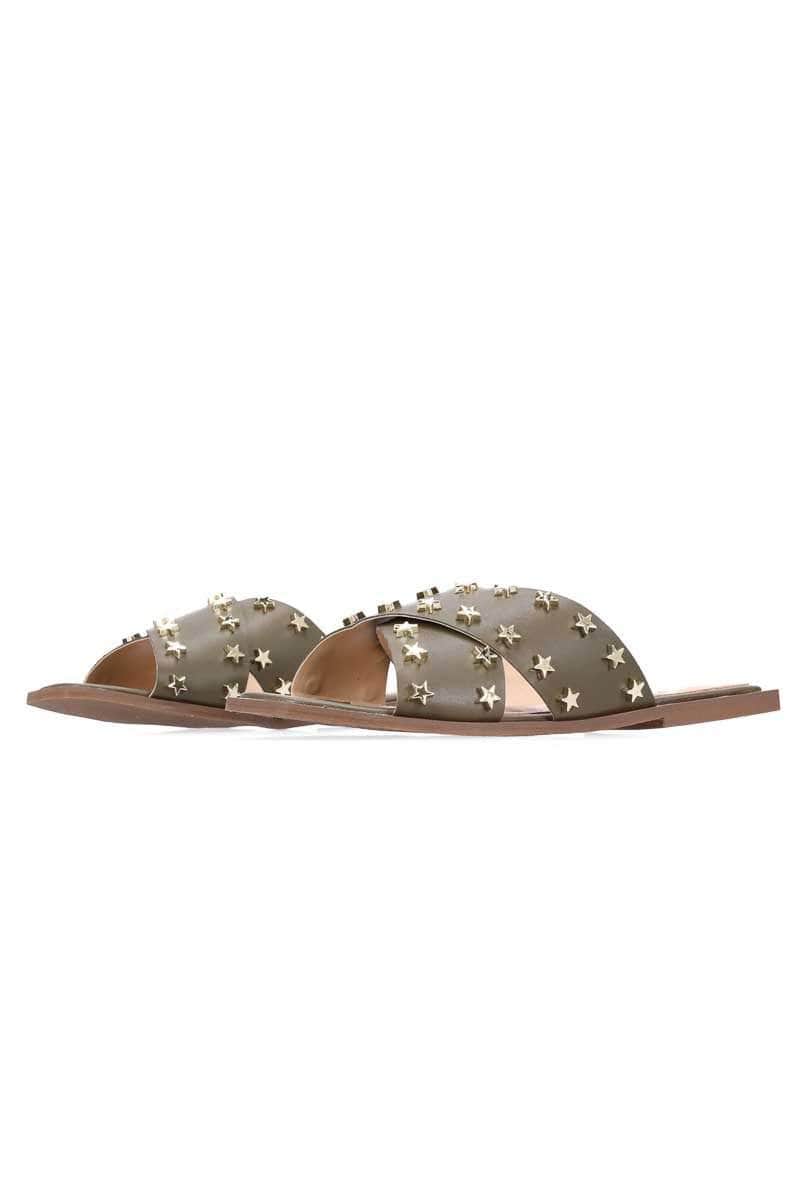 A khaki crossover sandal with gold star studs.
