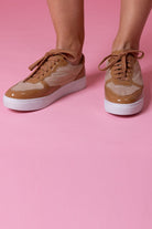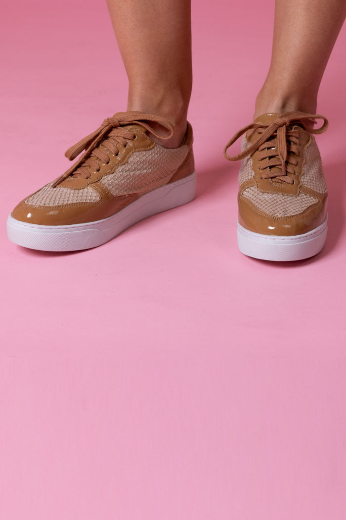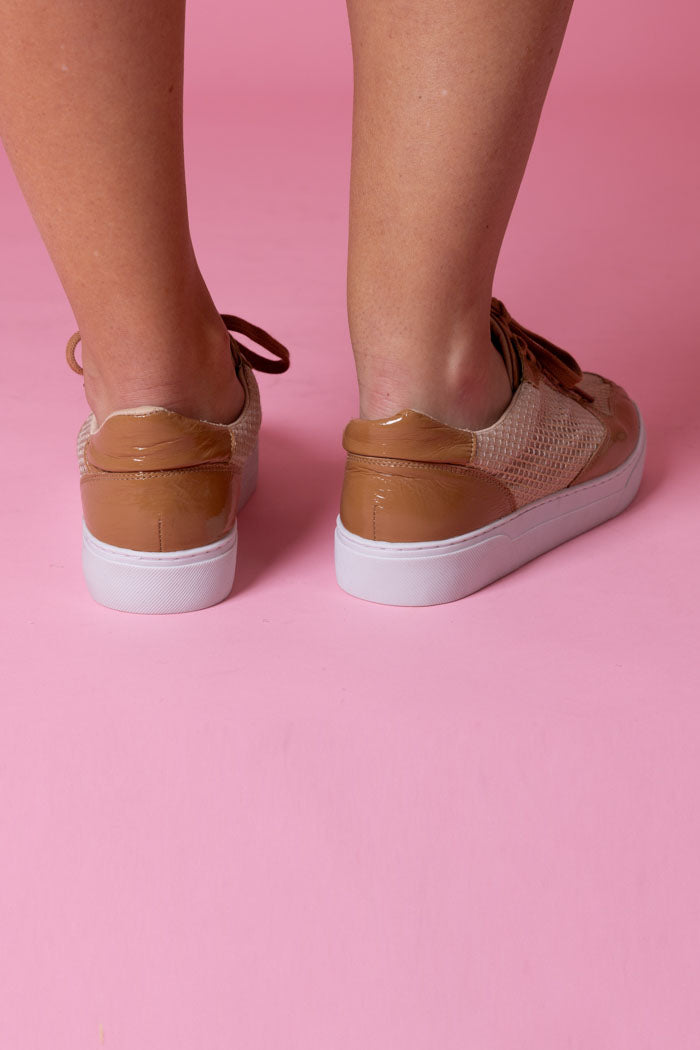 A brown & tan sneaker with mesh panels.