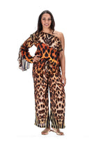 A brown animal print off-shoulder top with a single long sleeve, and a flounce around the neckline and down the sleeve.