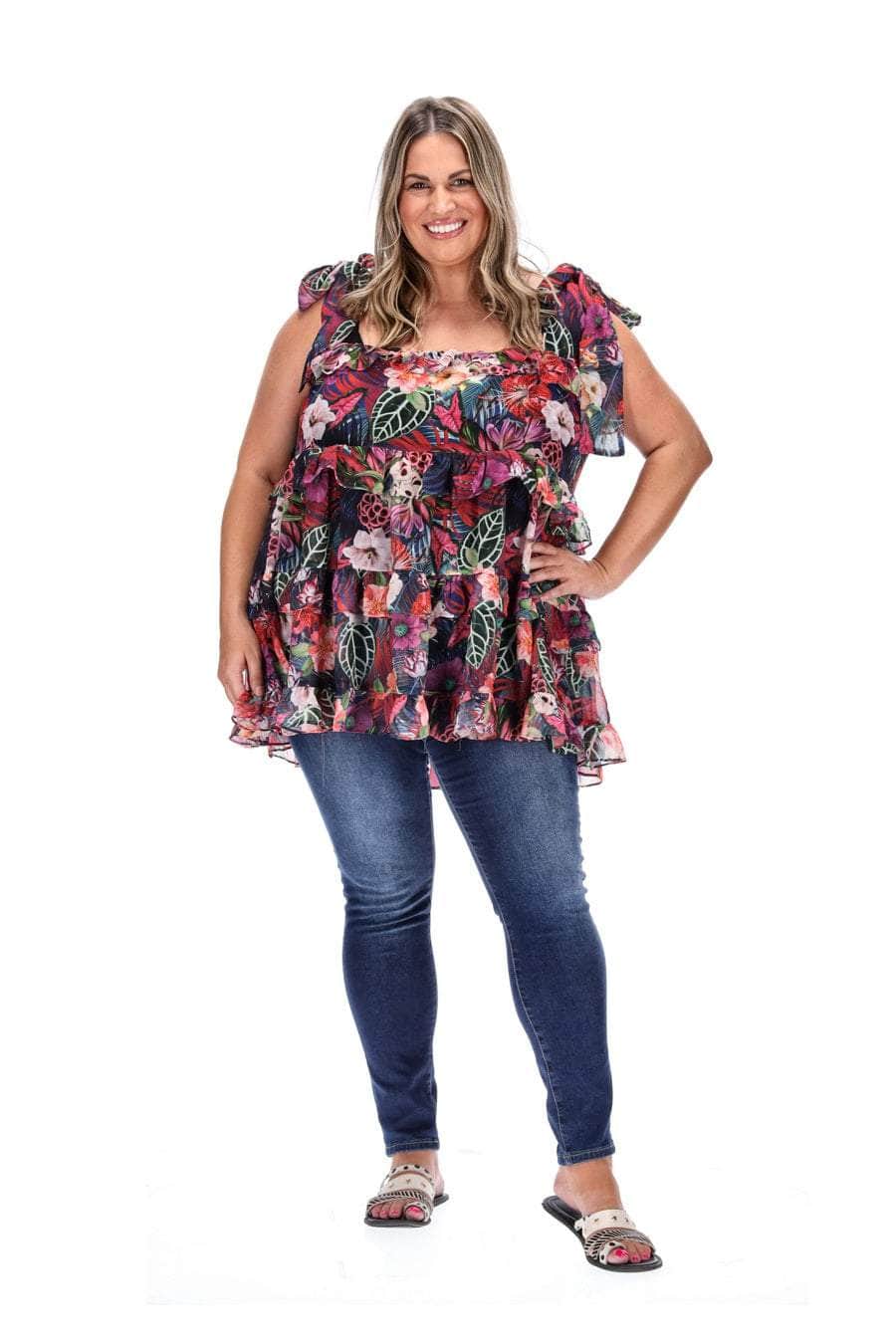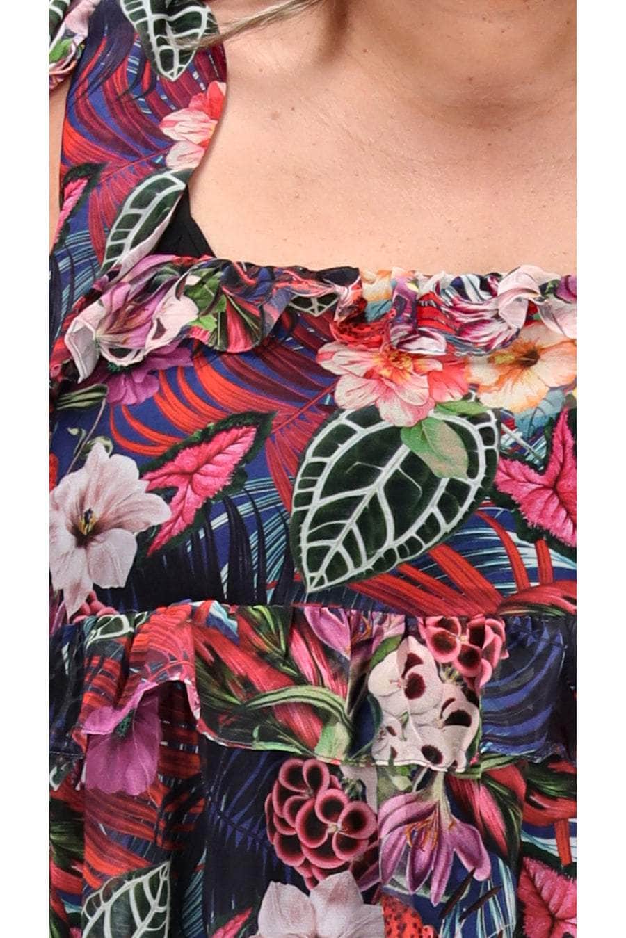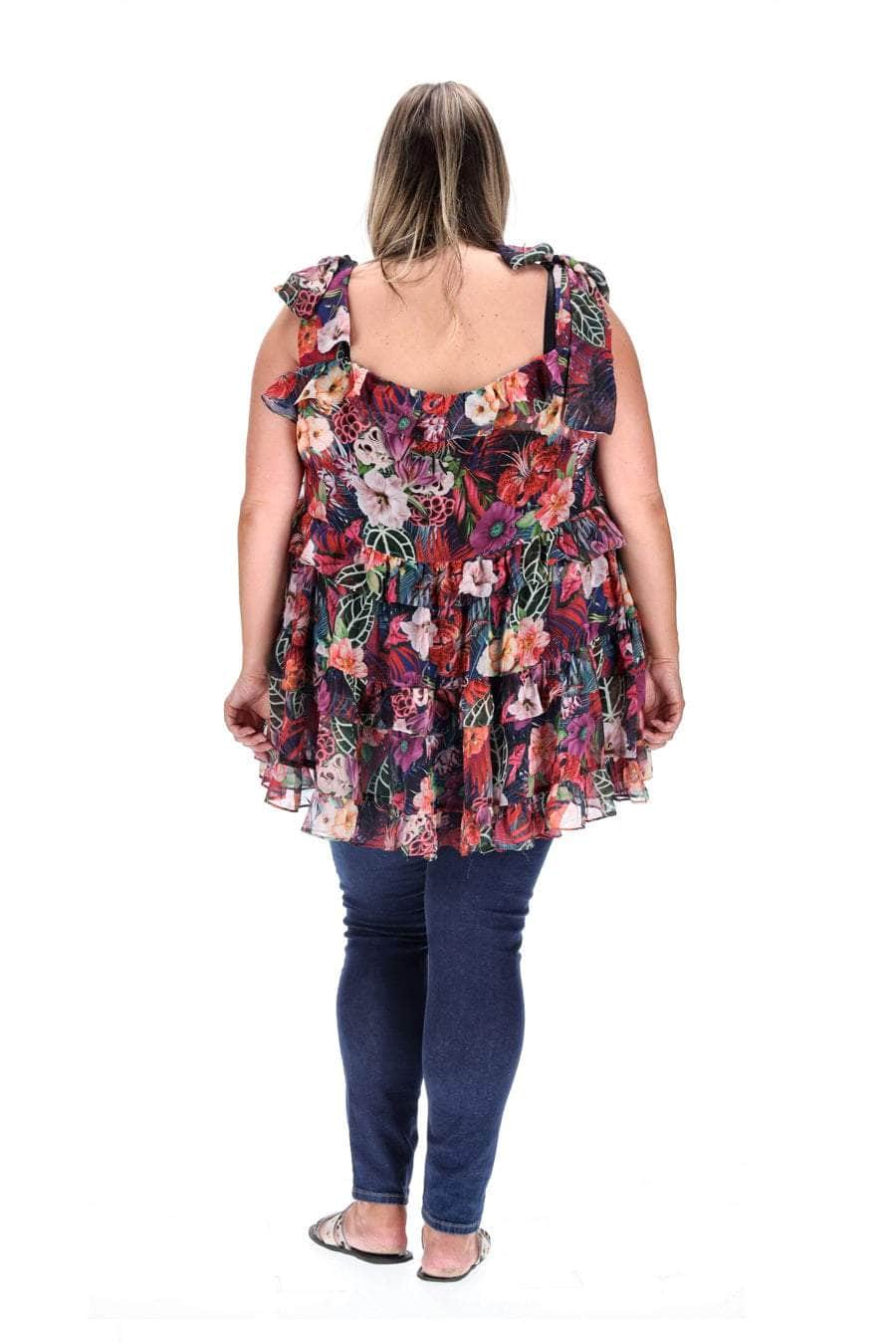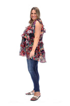 A tropical floral print layered tunic top.