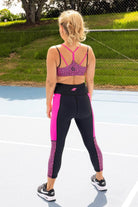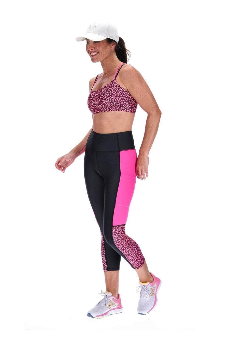 A black 7/8 length legging with hot pink & leopard print side panels.
