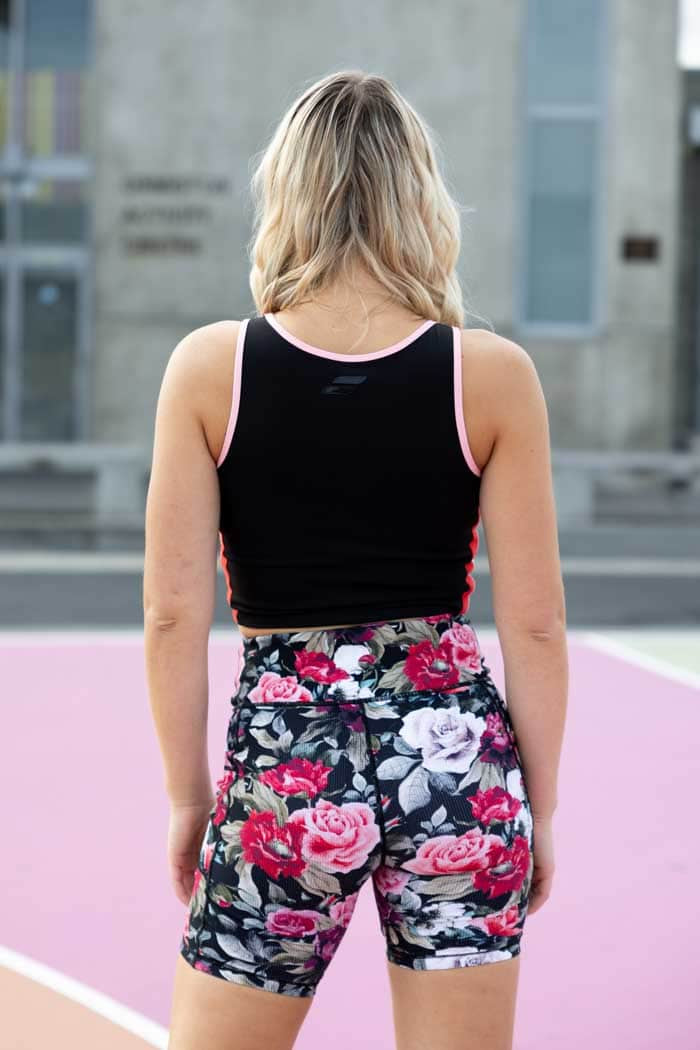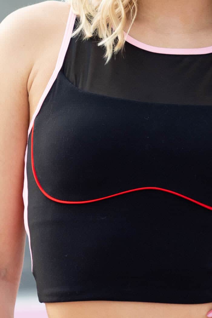 A black crop top with pink & red trim.
