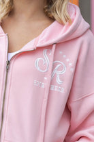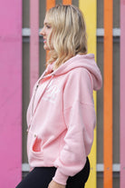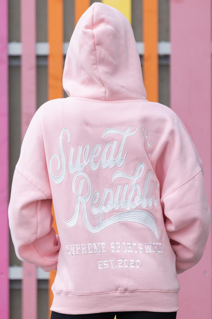 A soft baby pink hoodie, great for lounging or dressing up your activewear.