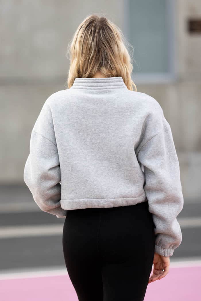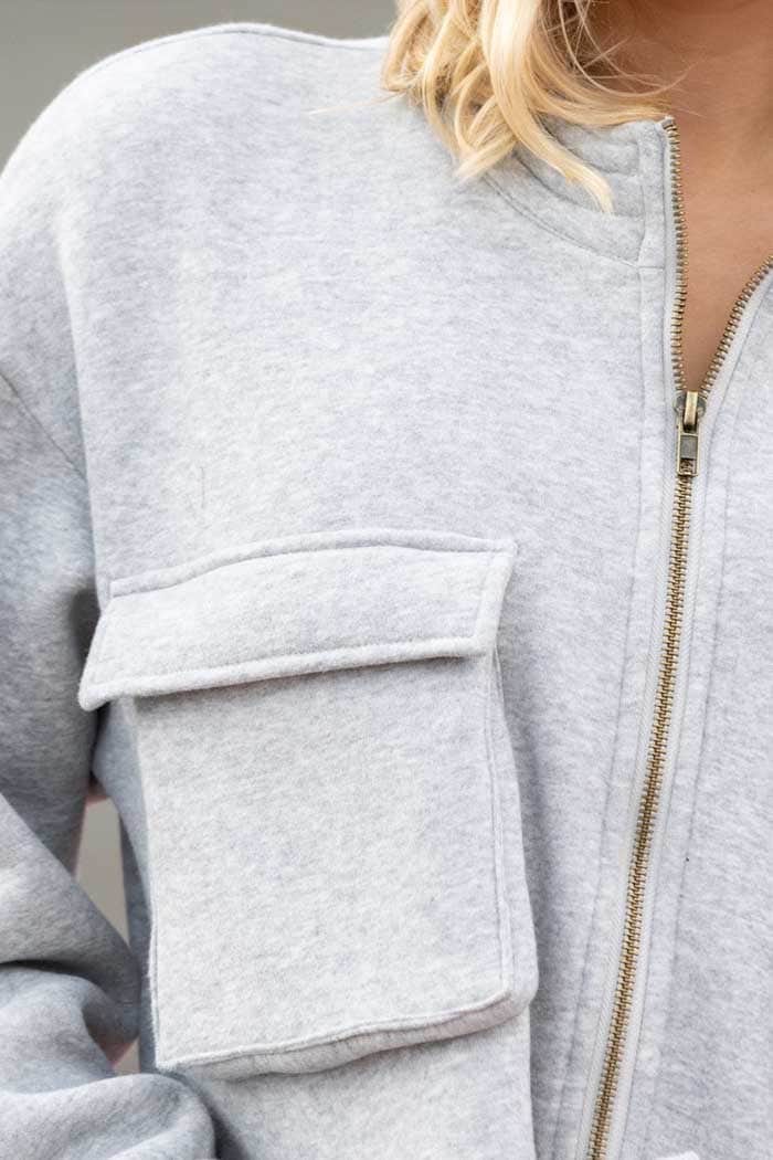 A cropped grey jacket with front cargo pockets.