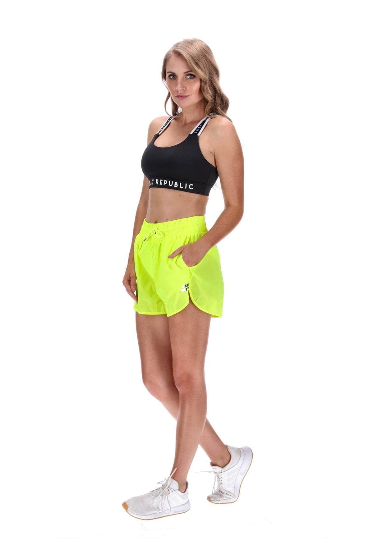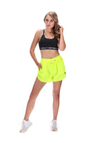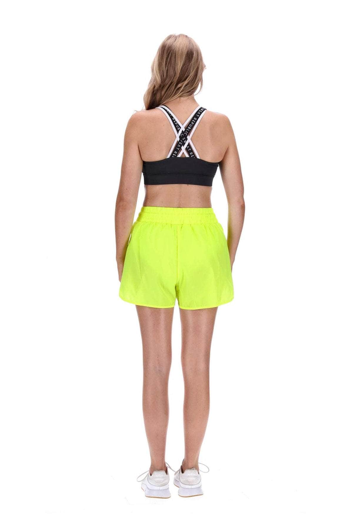 A fluro yellow woven short with side pockets, and built-in mesh underwear