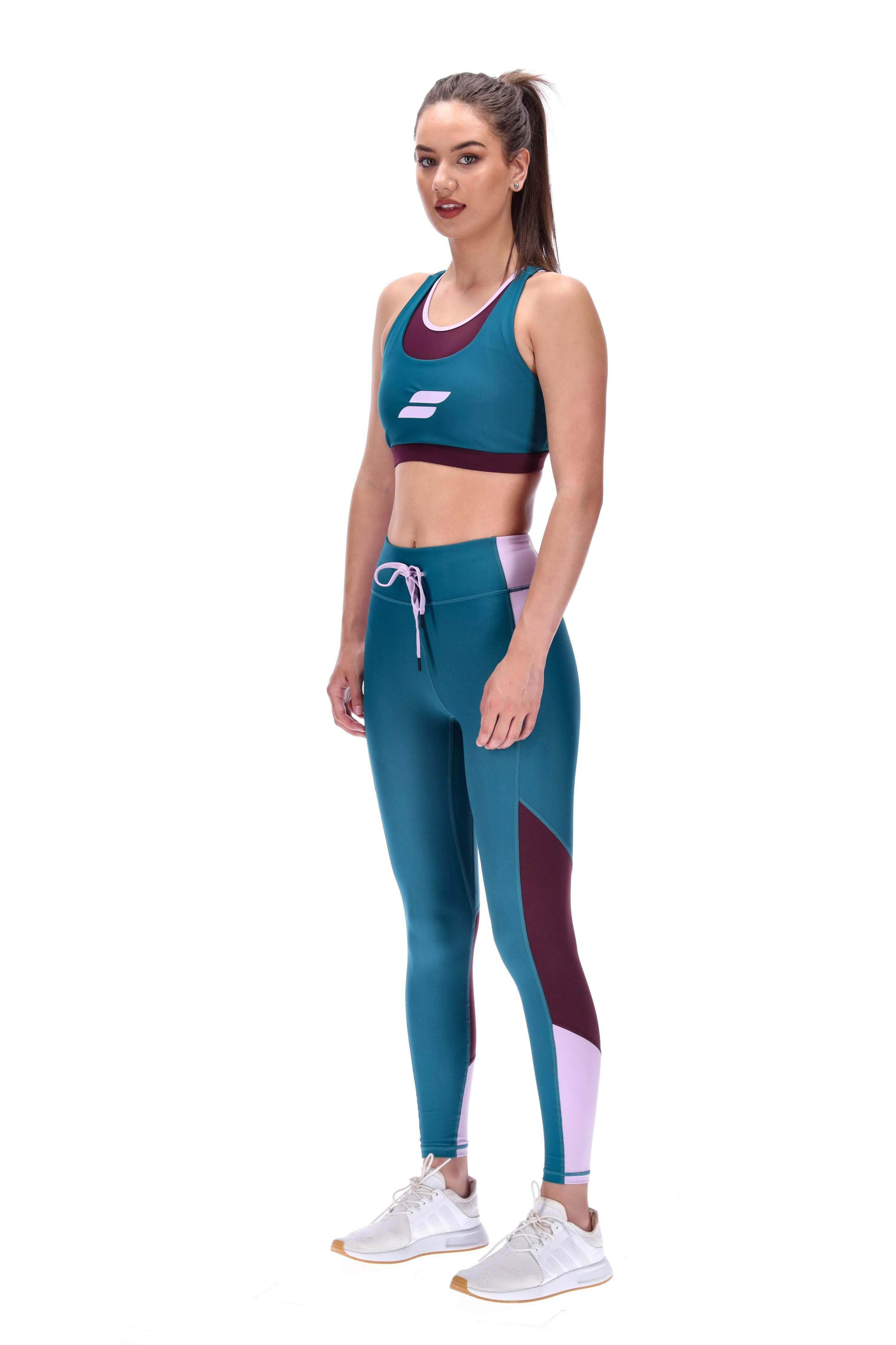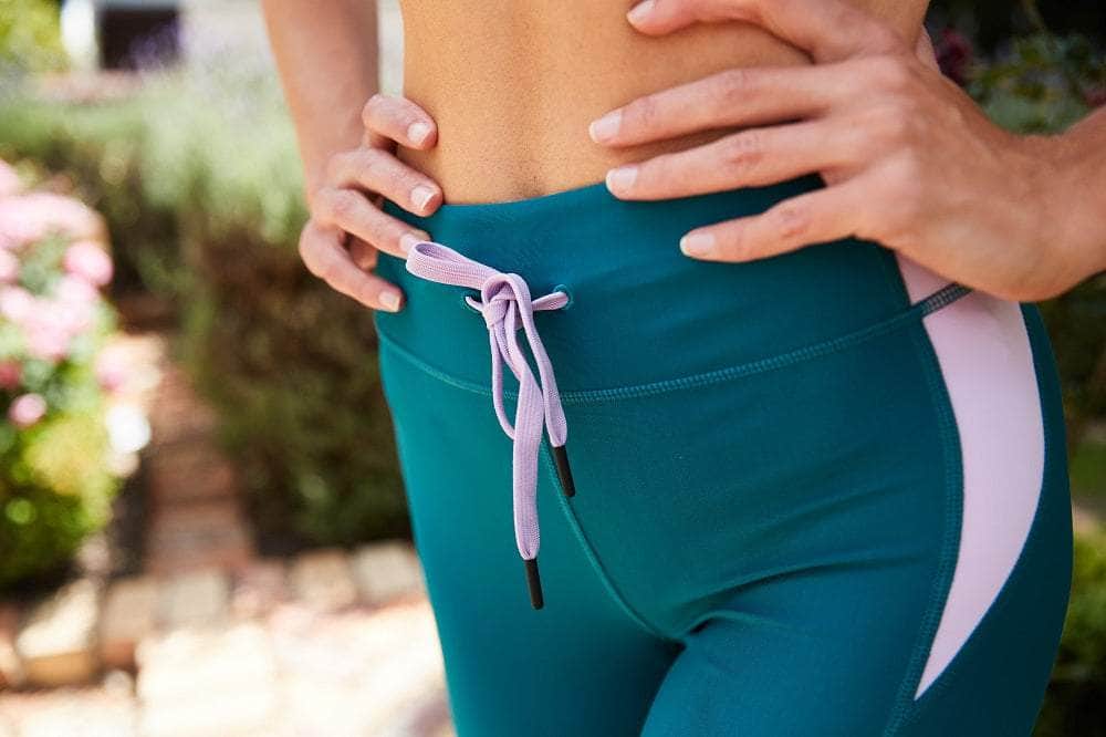 A lovely full length dark teak base legging with lilac and maroon panels at the waist and down the outer leg. Front waist drawstring and large phone pocket in back waist.