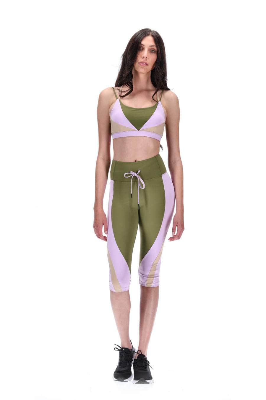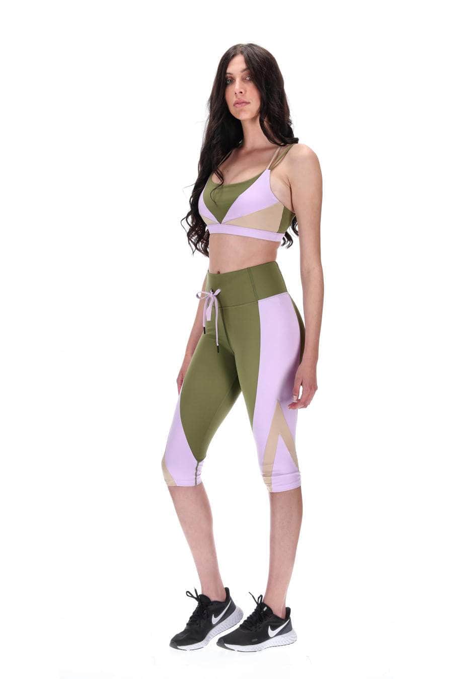 A lilac/beige/khaki lower cut bra with removable padded cups, double shoulder straps, and a strappy back design.