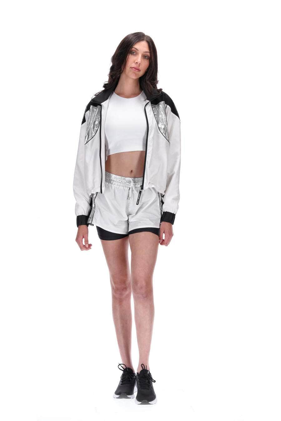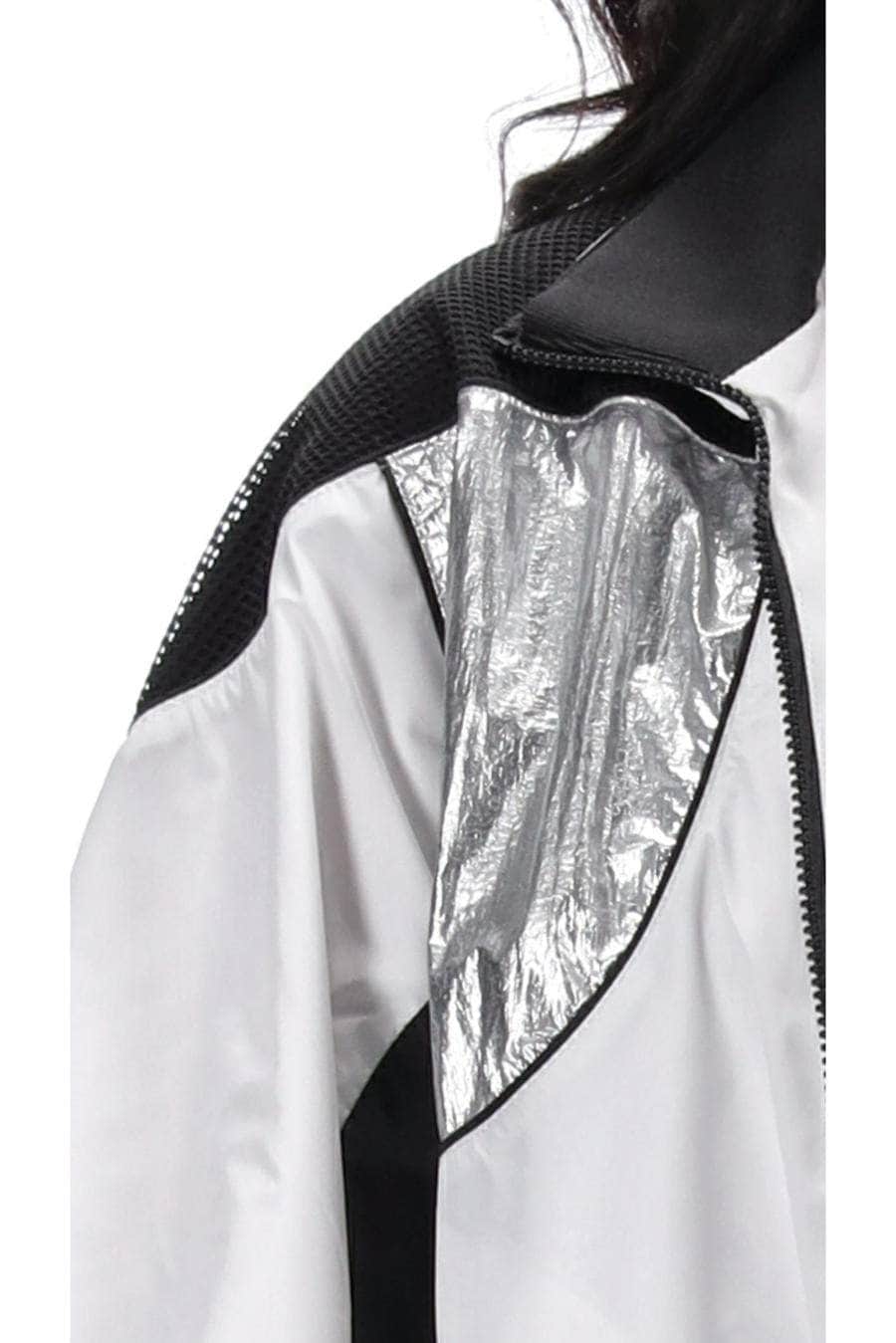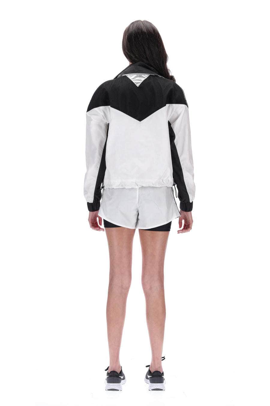 A white & black woven jacket with silver reflective panels on the front, and black mesh across the shoulders and down the back. Chunky black zipper down the front with a SR branded zipper puller. Invisible in seam zip pockets on the front sides. Drawstring hemline. Elasticated cuffs.