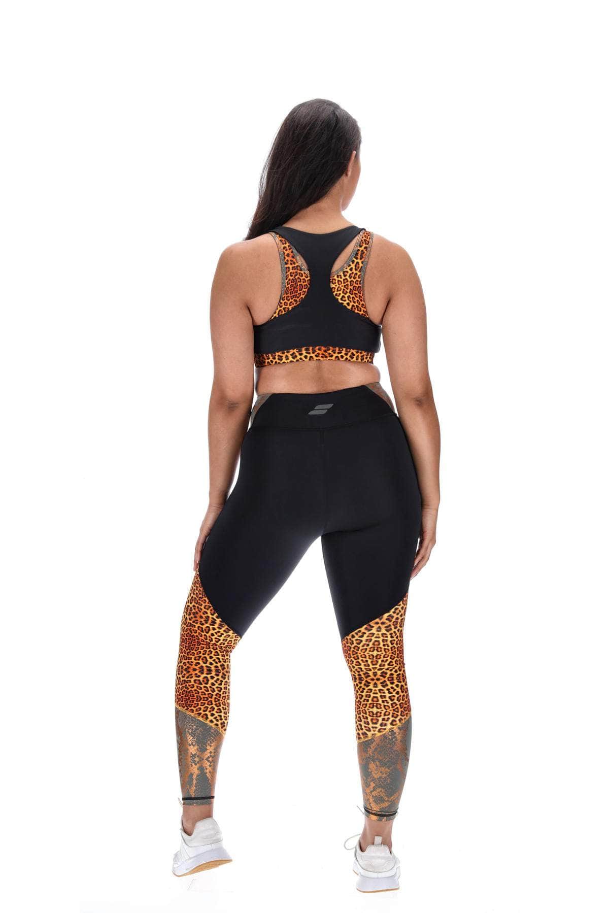 A black crop with contrast orange leopard print under layer & band; with scale print binding and SR logo at the front.