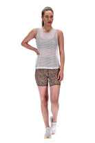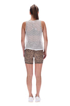 An edgy white mesh relaxed fit tank singlet with beige binding around the neckline and armholes. Neckline is high and armholes are dropped for greater comfort.