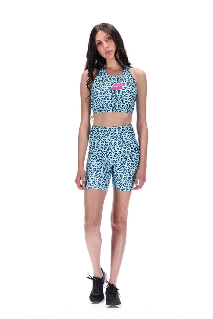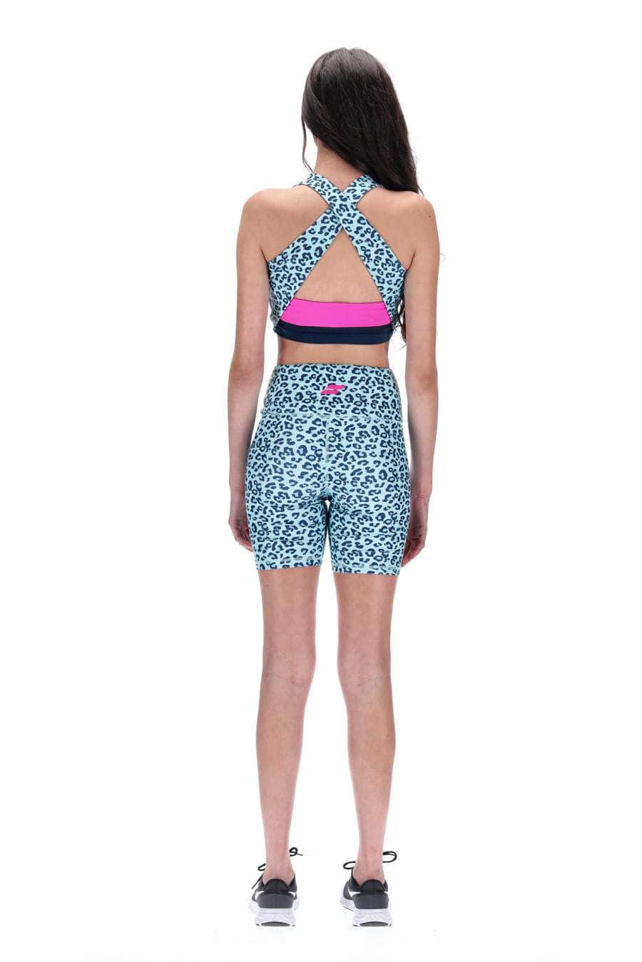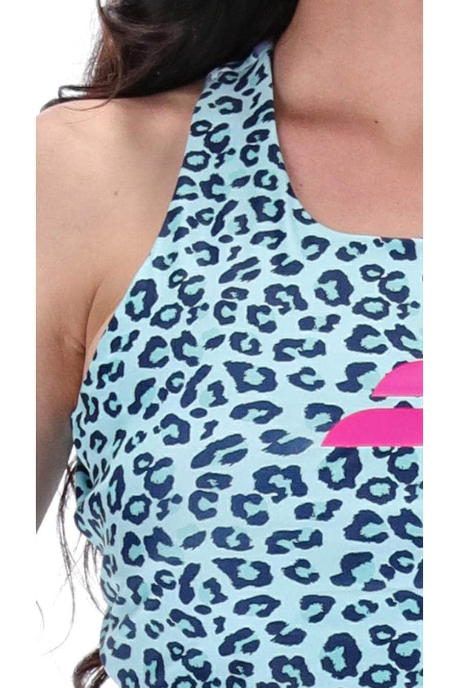 A teal leopard print double-layer crop top with a built in removable padded bra, and crossover back straps and pink/navy band. A great full coverage top for more comfort.