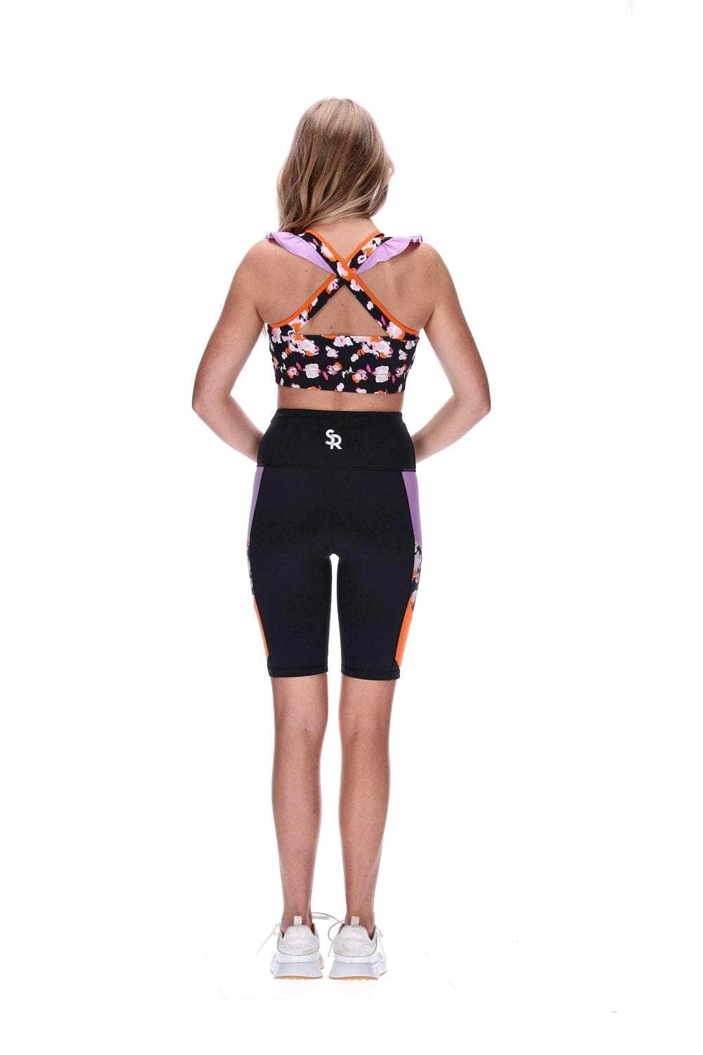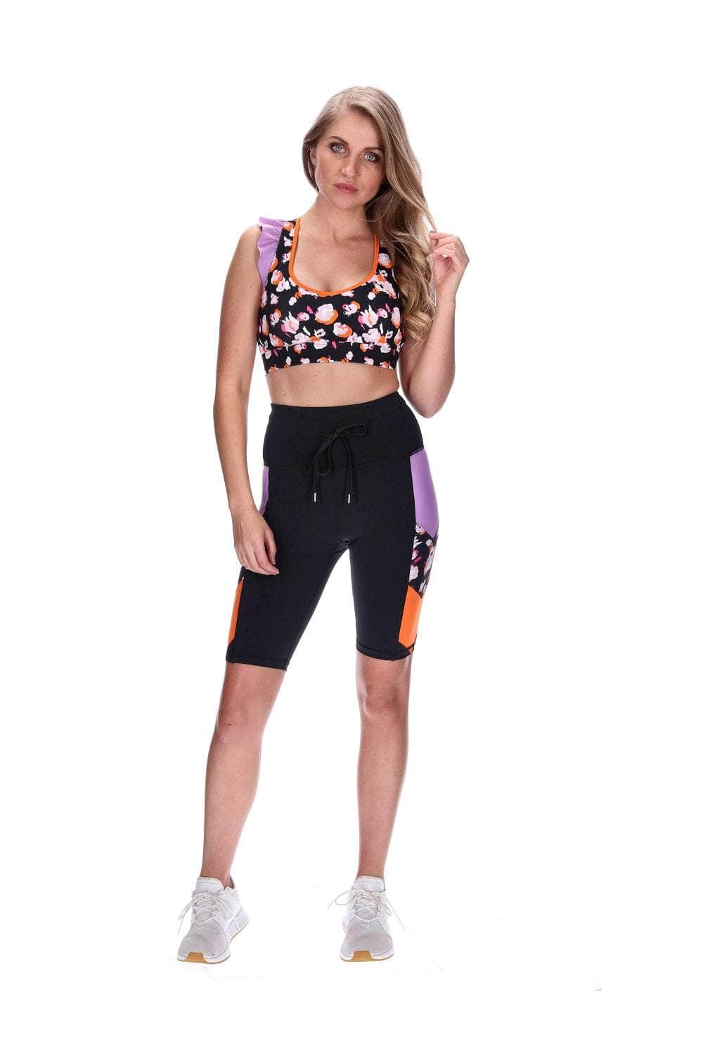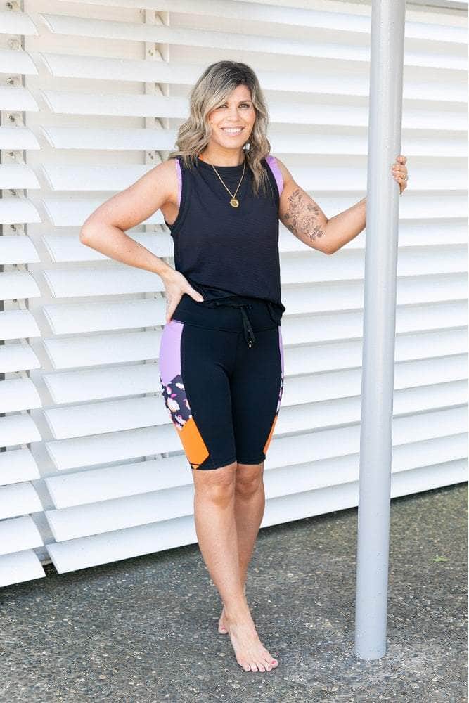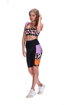 A lovely black base high waisted biker short with coloured arrow shaped panels down the sides. It has a large inner back phone pocket, and a drawstring at mid waist.