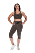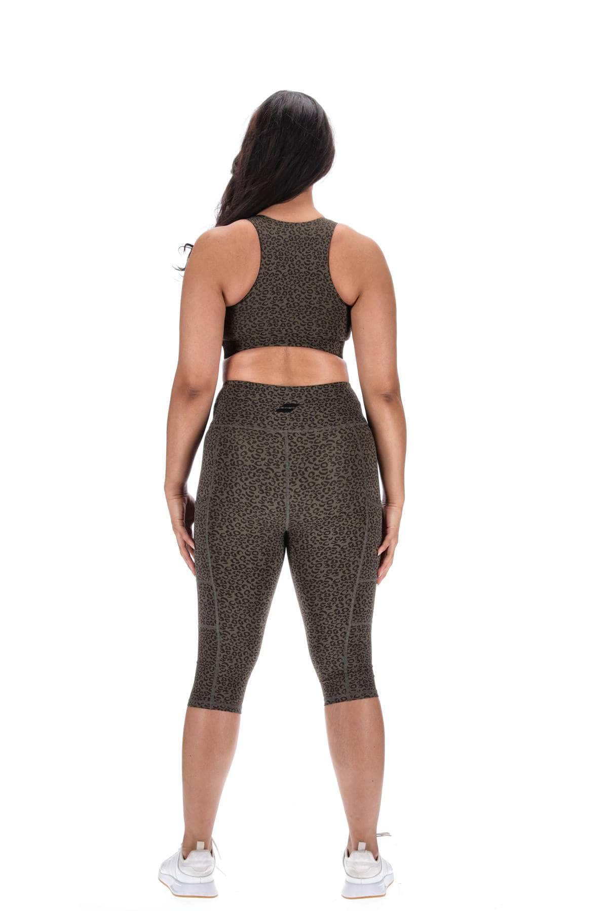 A dark khaki leopard print 3/4 length legging, with a black drawstring waist tie. Double side phone pockets.