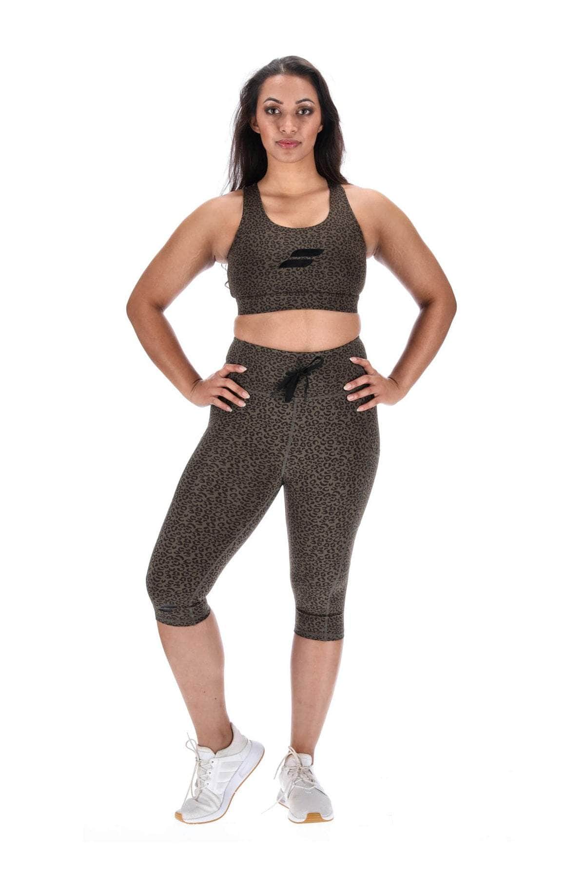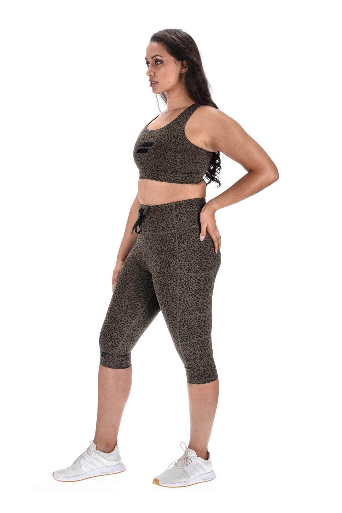 A dark khaki leopard print crop with scoop neck and black SR logo on the front.