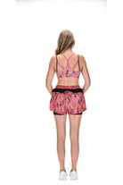A pink snake print woven short, with a longer fitted black knit inner bike short. Waistband is elasticated with an adjustable drawstring. Inside bike short has a front leg phone pocket.