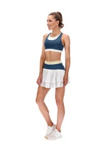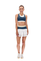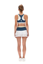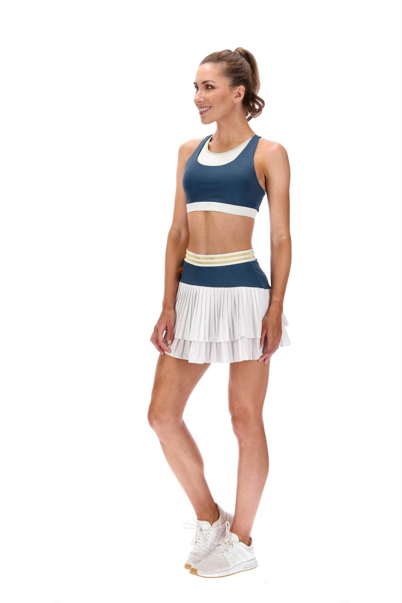 A gorgeous dark teal sports bra with contrast white under layer, with mint trim and SR logo at the back