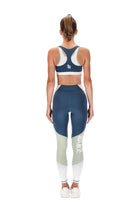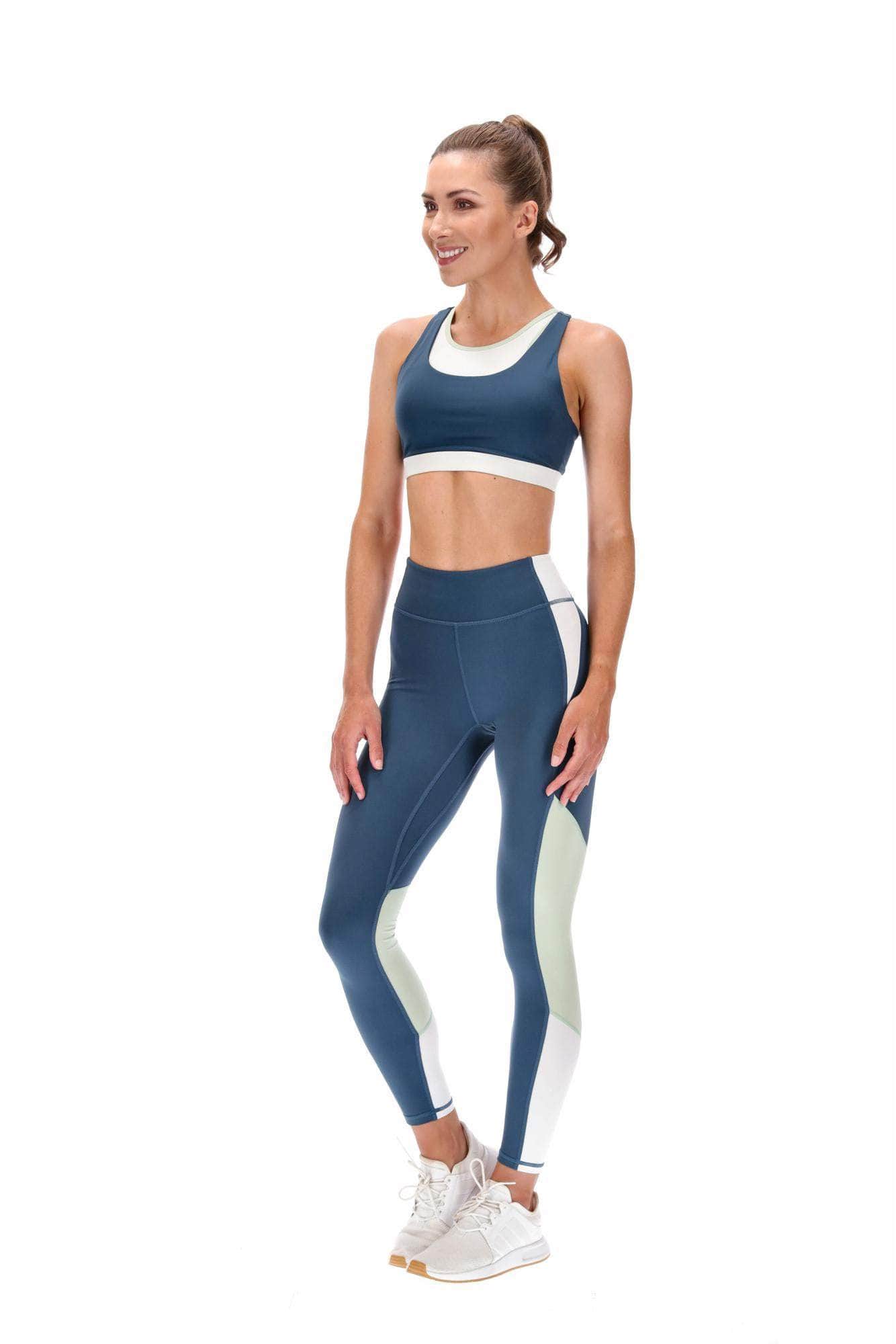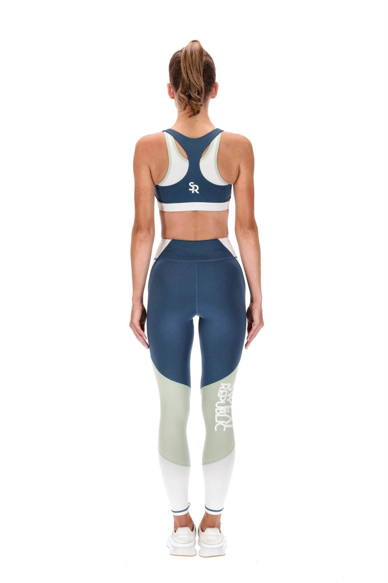A lovely full length dark teak base legging with white & mint panels at the waist down the outer leg. SWEAT logo on back leg, and large phone pocket in back waistband