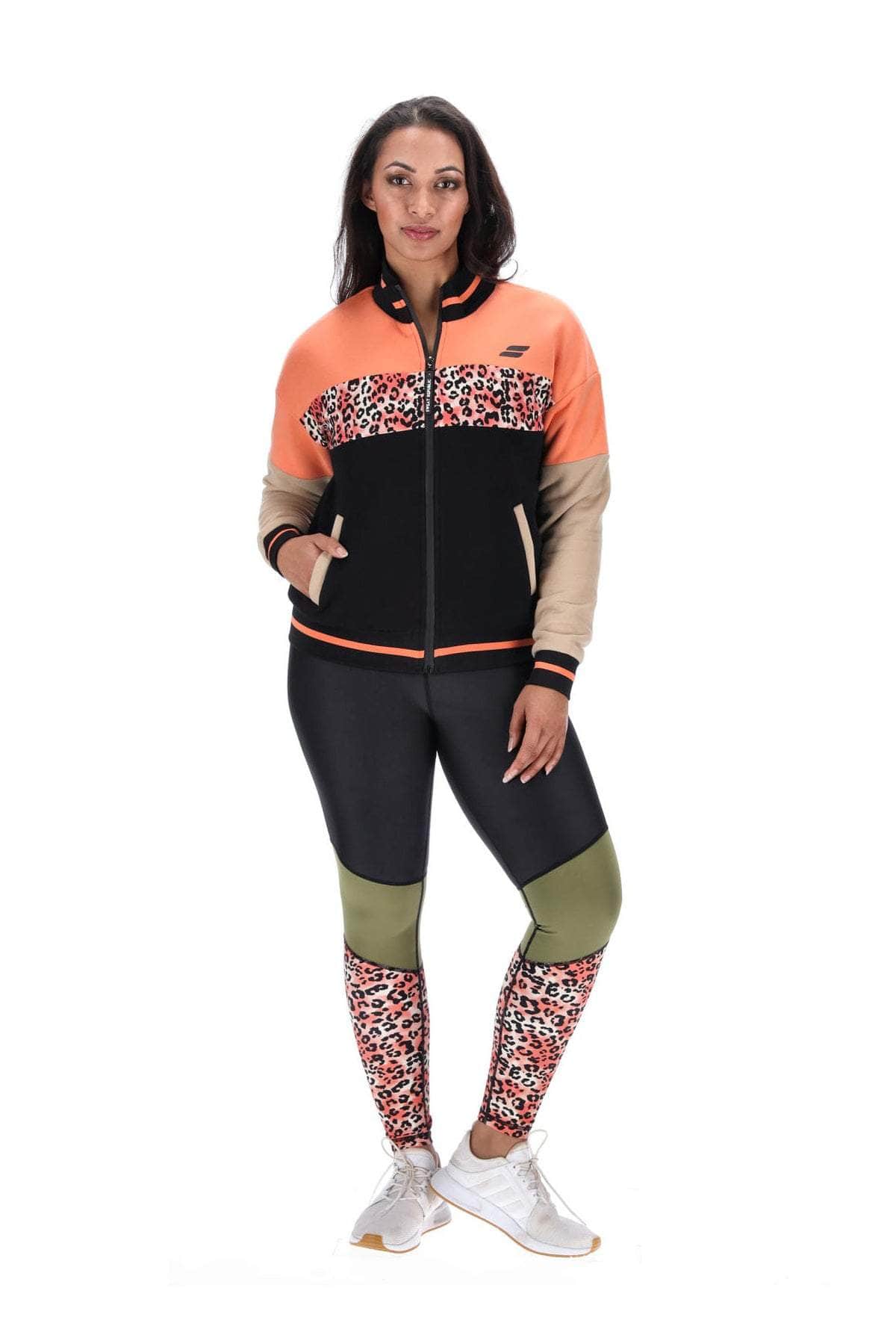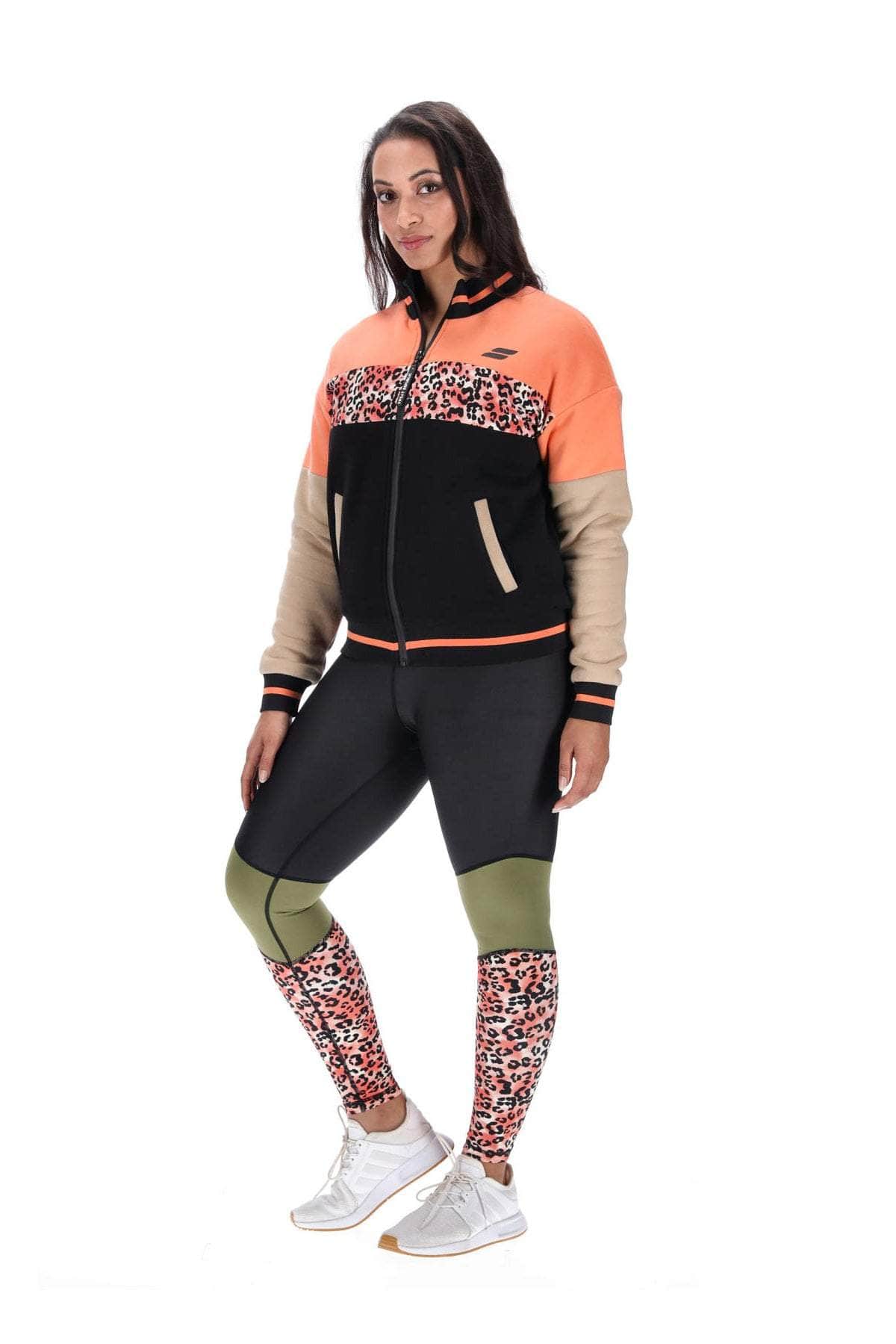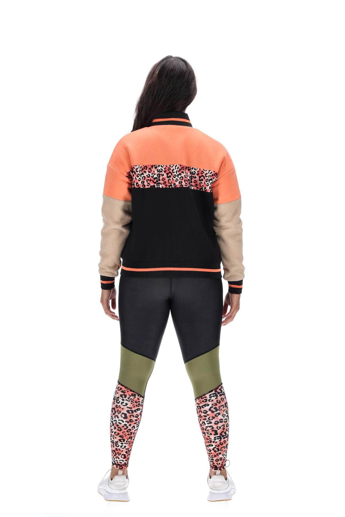 A gorgeous orange, black and orange leoaprd print crop jacket with a zip-down front, beige front pockets & long sleeves. Neckline, cuffs and hem have wide striped black ribbing.