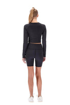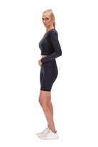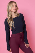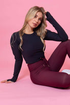 A black ribbed long-sleeve crop top with an in-built padded shelf bra, and thumb holes