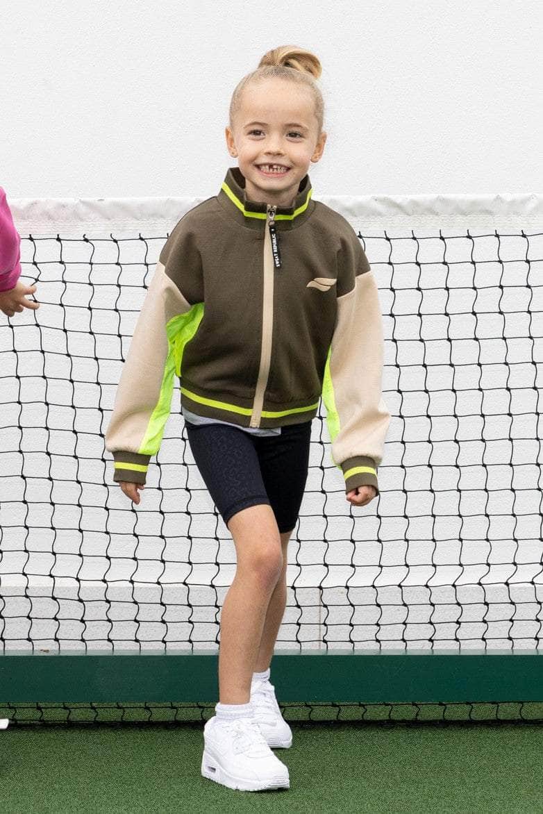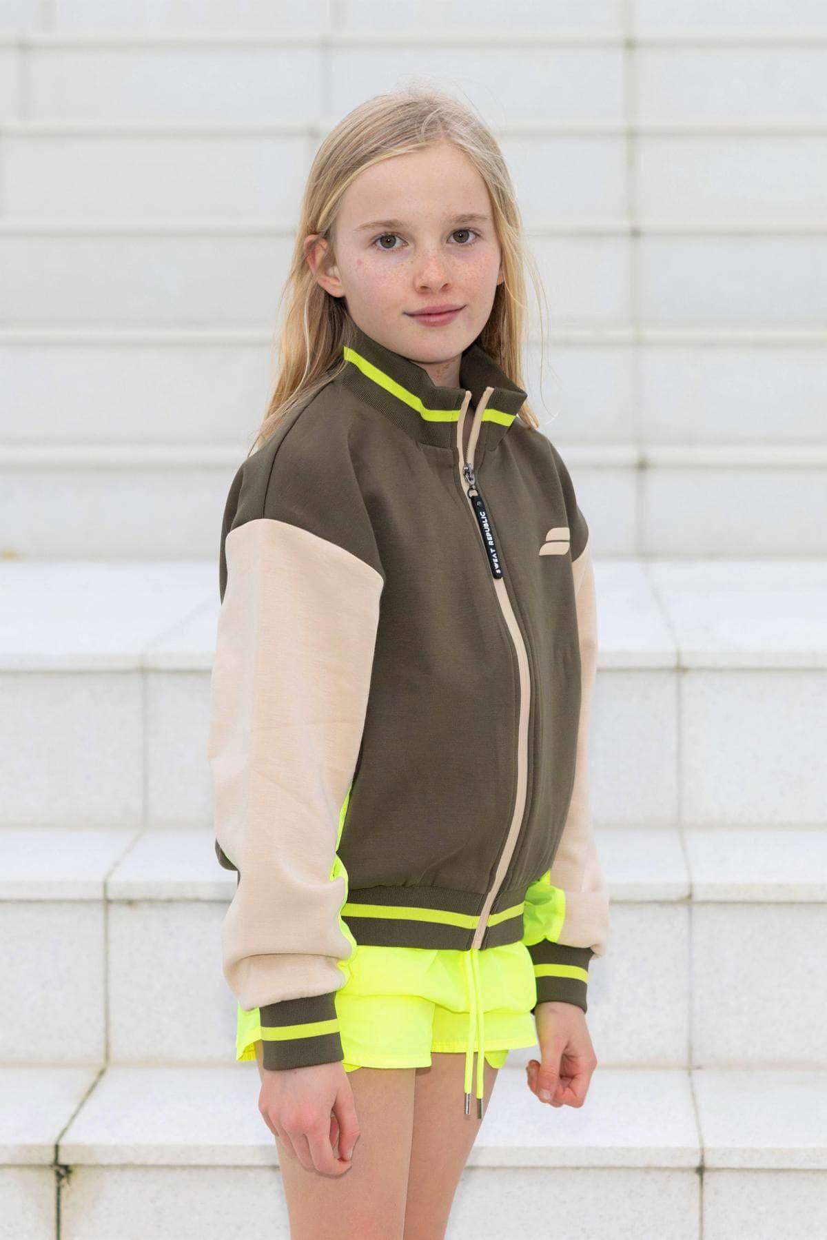 A khaki zip-up sweatshirt with beige panels on the top sleeves, and fluro yellow lightweight woven panels underneath the arms and down the side body. A high ribbed neckline for warmth and comfort; and matching ribbing at the cuffs and hem. SR branded zipper puller.