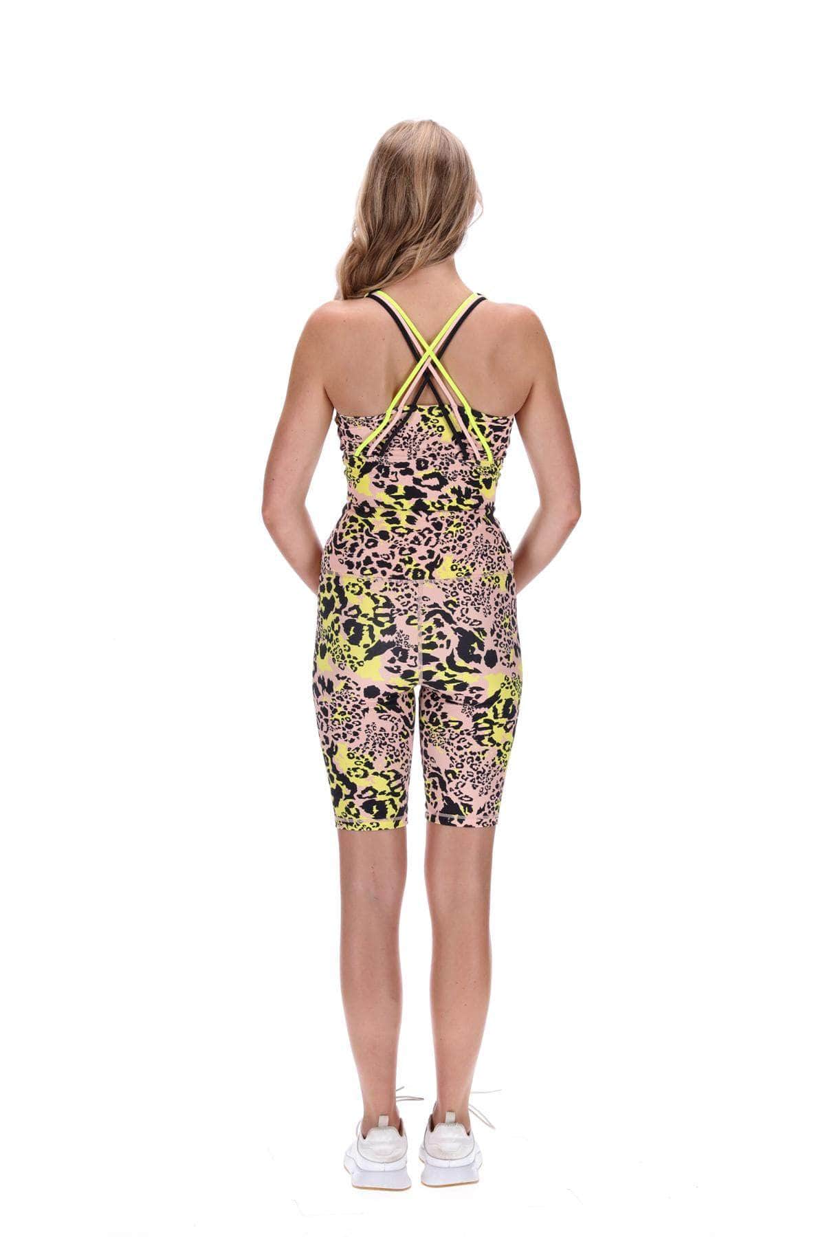 A highwaisted beige/fluro yellow leopard print rib biker short with a back waistband phone pocket