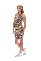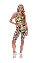 A long beige/fluro yellow leopard print rib crop, with a strappy back design