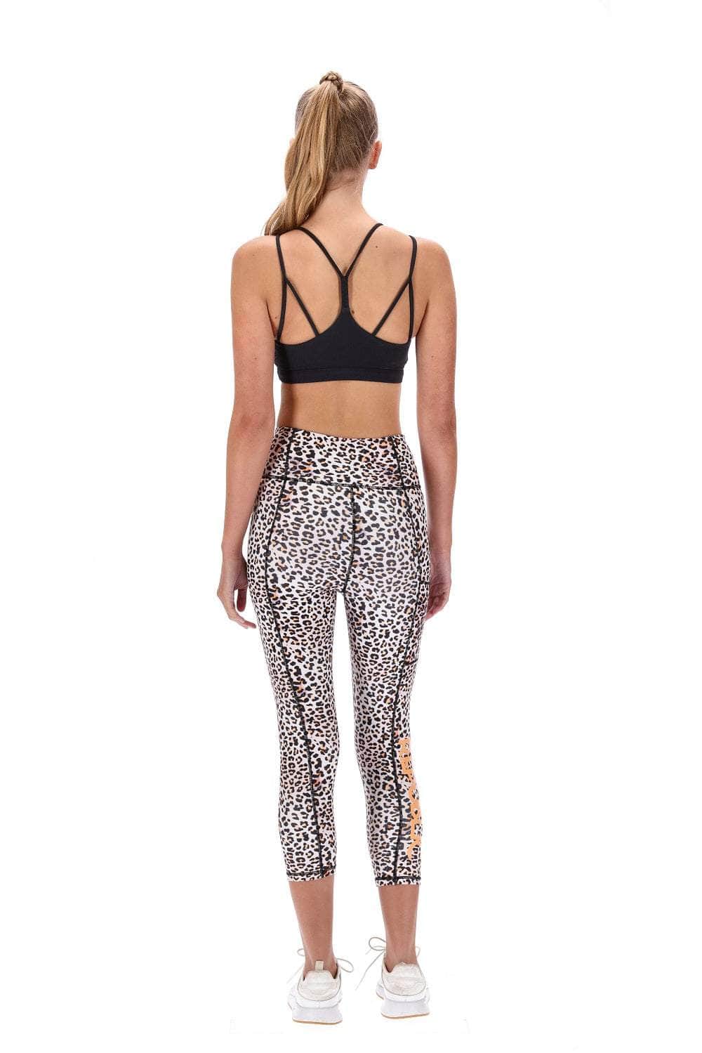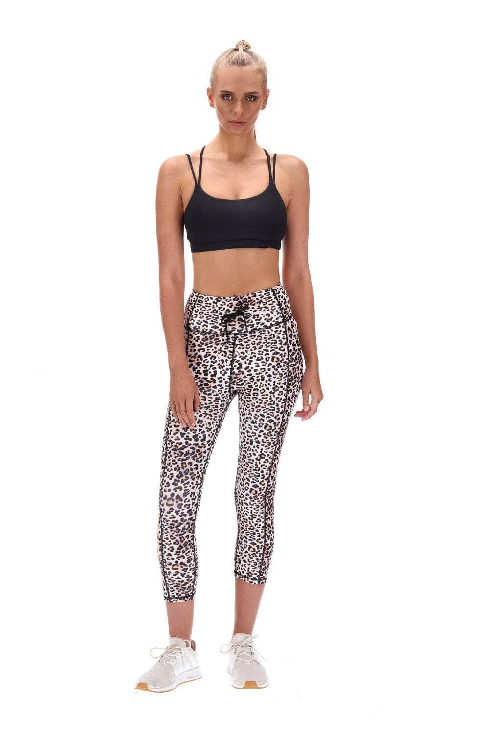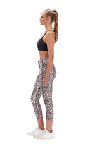 A white/pale lilac leopard print 7/8 length legging, with side pocket and a black front waist drawstring.