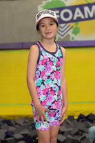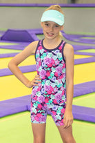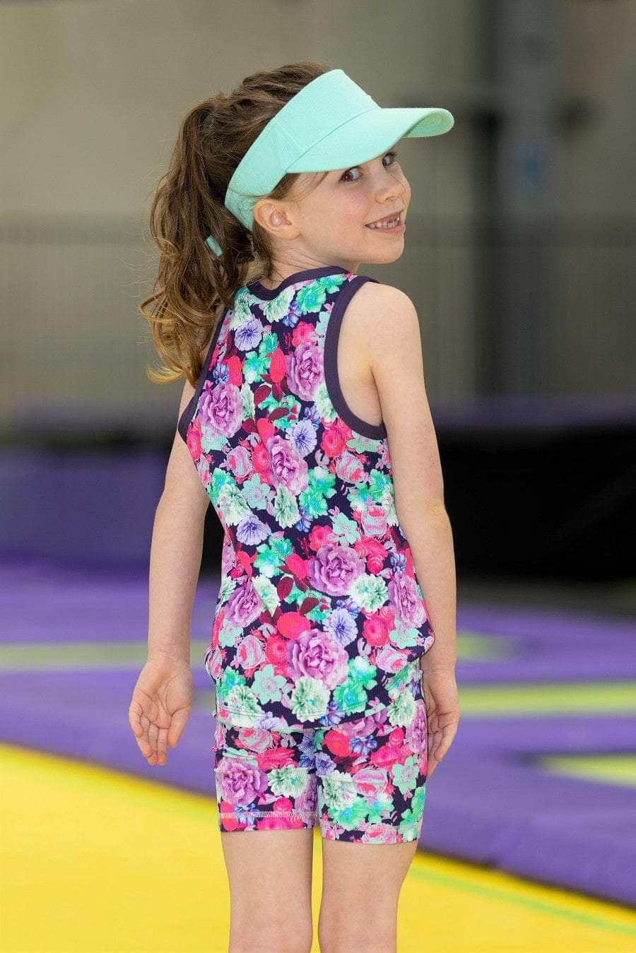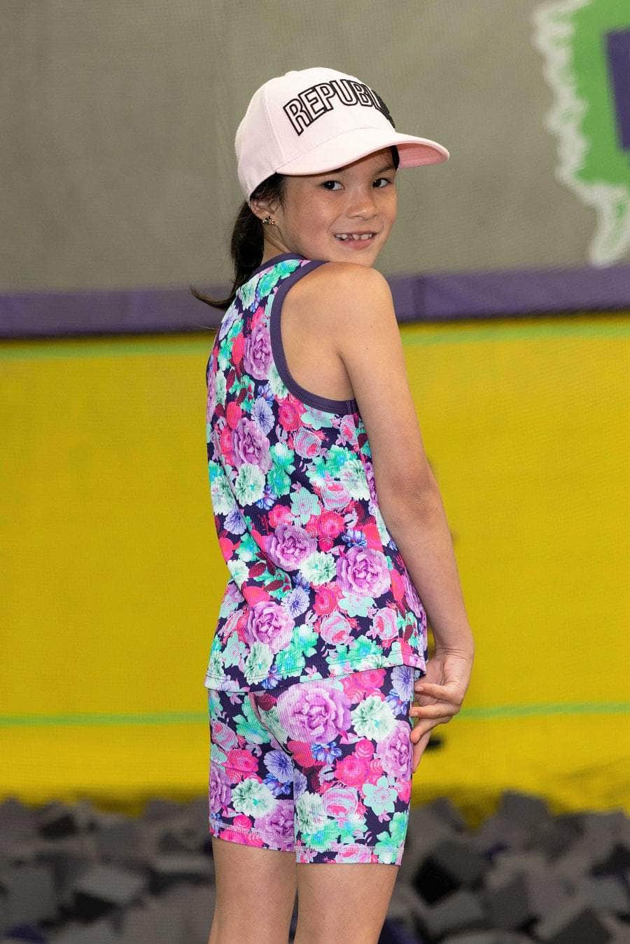 A mauve floral print ribbed singlet top with a bound neckline and armholes.