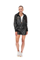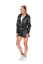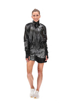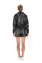 A black faux-leather jacket with zip-up front, ribbed collar & cuffs, a waist drawstring; and pleated shoulder details. Cuffs are extra long to cover your hands and include a thumb hole.