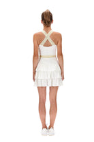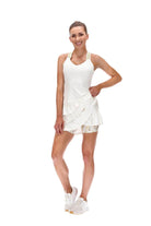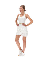 A stunning light cream stretch soft V neck mini dress, with gold striped elastic crossover shoulder straps and a layered flounce skirt. Includes a detachable gold striped elastic belt. The biker is light cream base with a gold snake print.