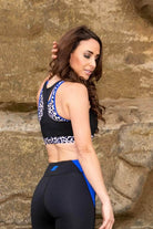 A fun black sports bra with contrast cream leopard under layer, blue SR logo on the front and binding