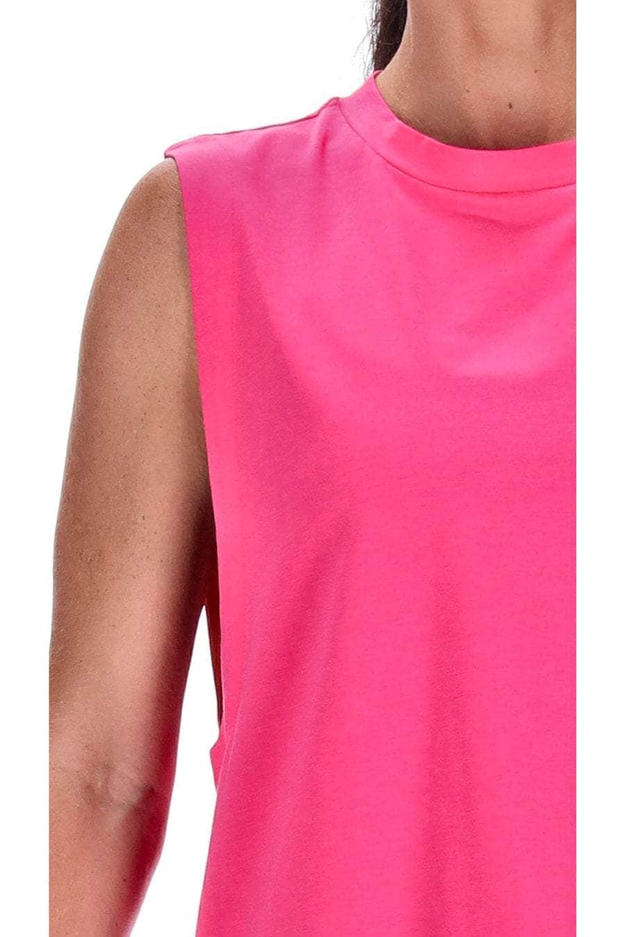A high neck hot pink tank top with low armholes.